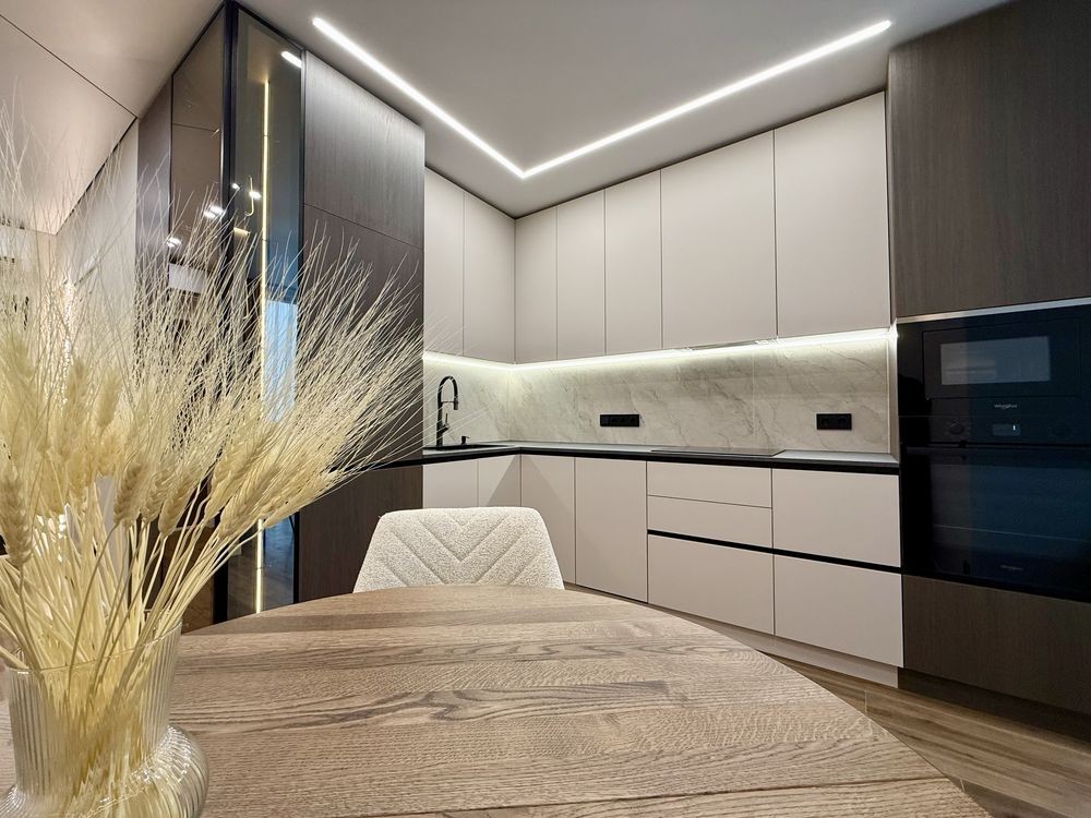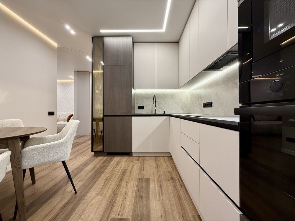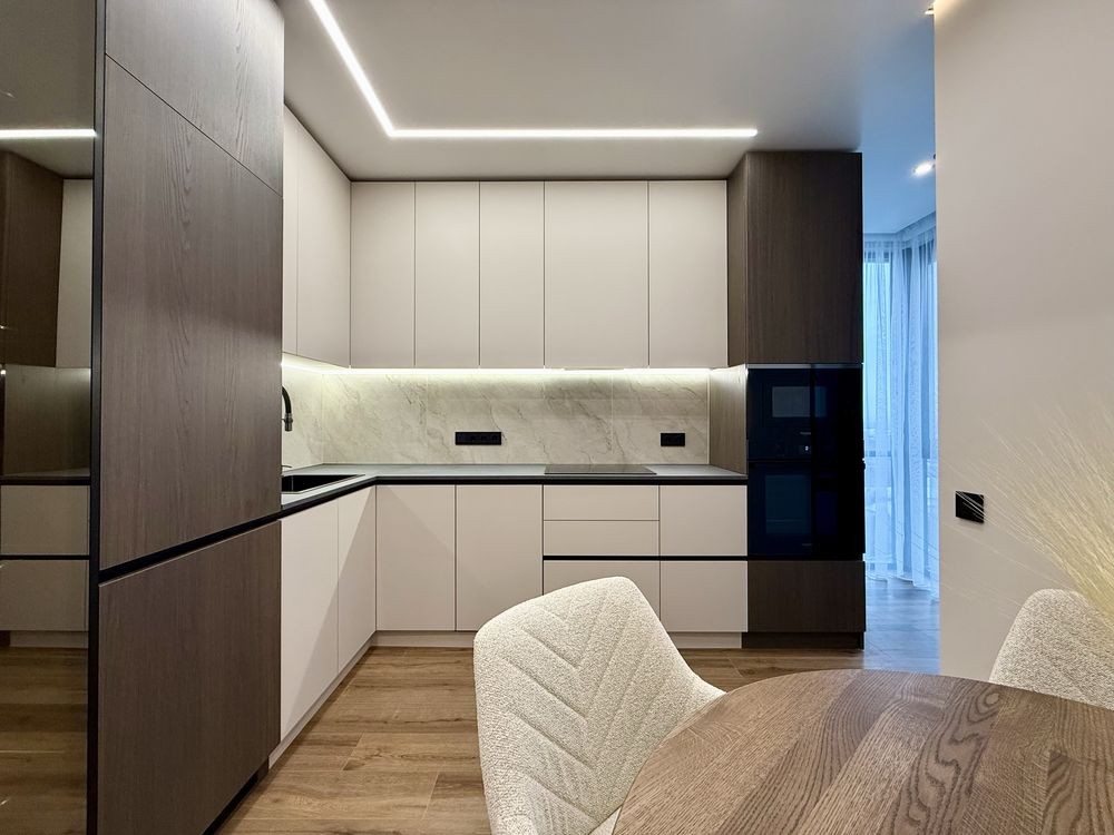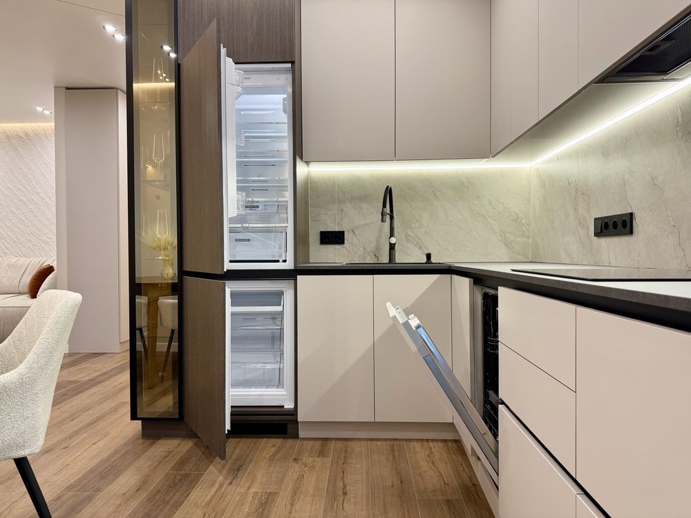 - Кухня повністю укомплектована меблями та сучасною технікою: вбудований холодильник, посудомийна машина, духовка, мікрохвильова піч, індукційна варильна поверхня. Є обідня зона та невелика кладова.