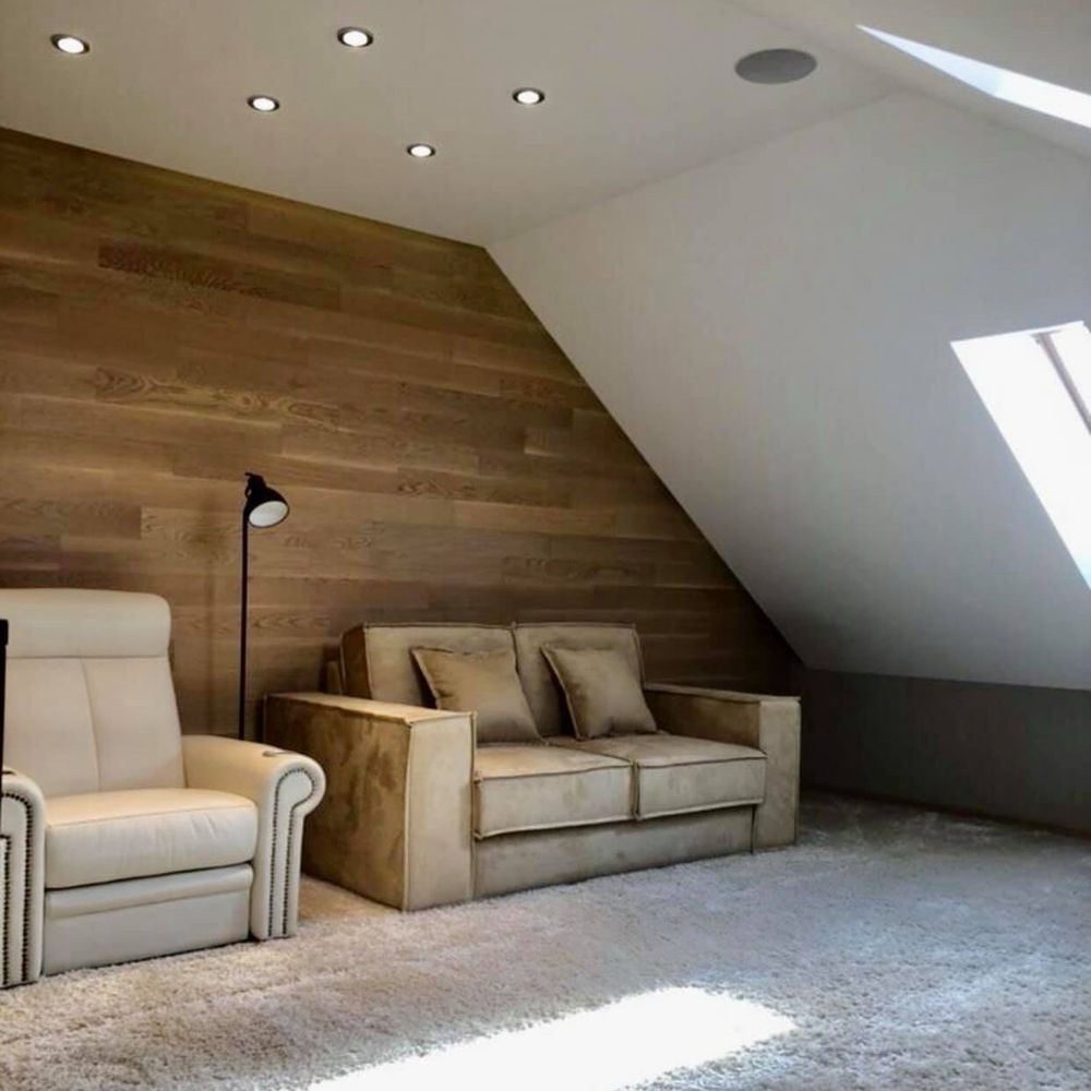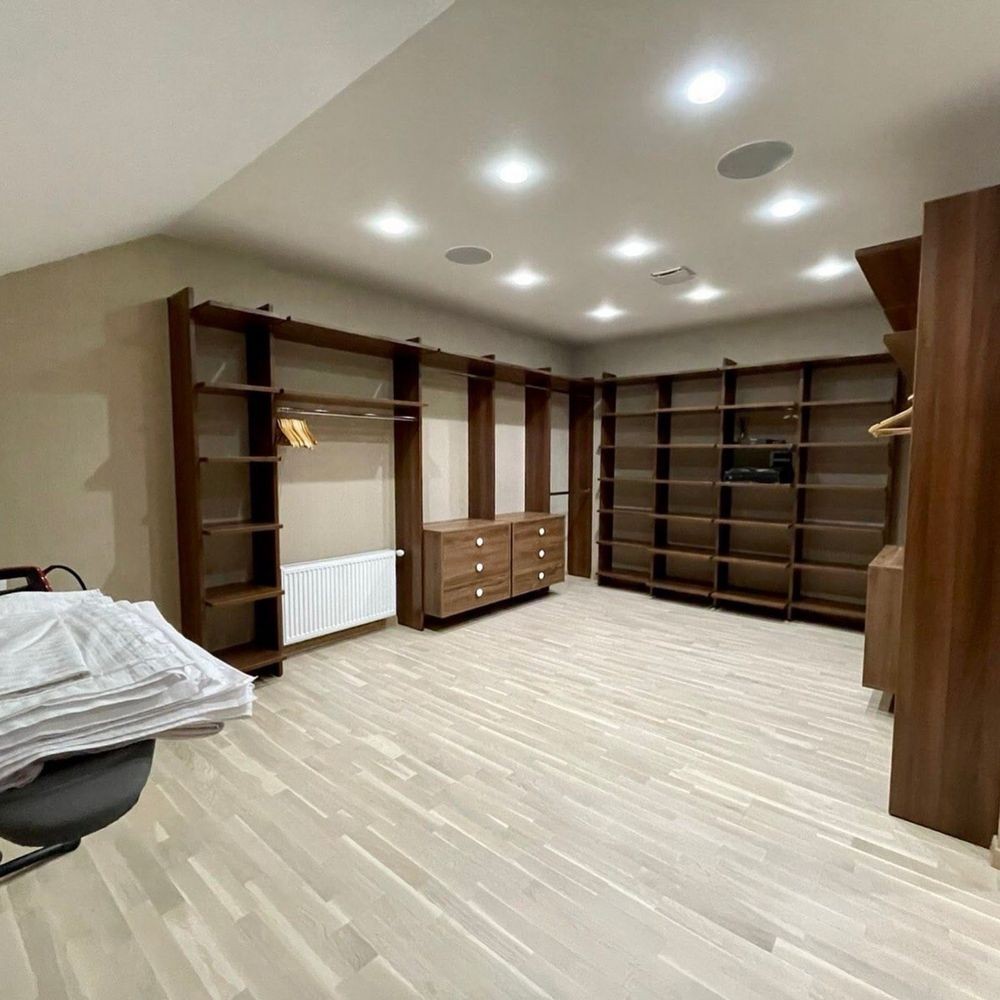 Два этажа, три уровня. Дом имеет 5 комнат: 3 спальни, гостиную, кухню-столовую, несколько санузлов и несколько гардеробных комнат. Третий этаж - свободное пространство.