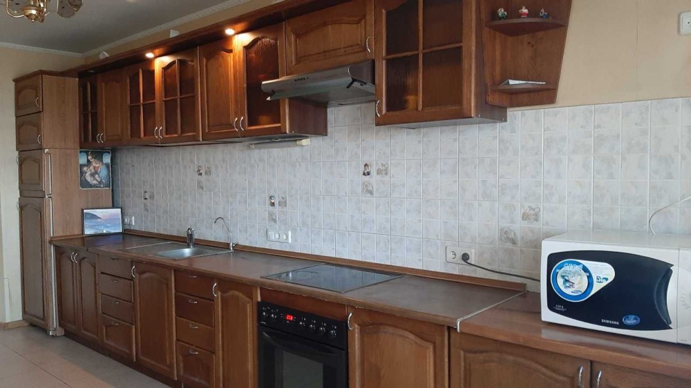 Вбудована кухня, фасади - натуральний дуб, електрична варильна поверхня, холодильник; у коридорі - дзеркальна шафа-купе, міжкімнатні двері - натуральне дерево, вхідні двері - броньовані, підвищеної міцності. В дитячій кімнаті та у вітальні є 2 розкладних дивани, у кухні - м"який куток.