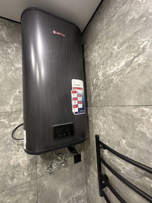 Сучасна ванна кімната з пральною машиною-автомат та бойлером.