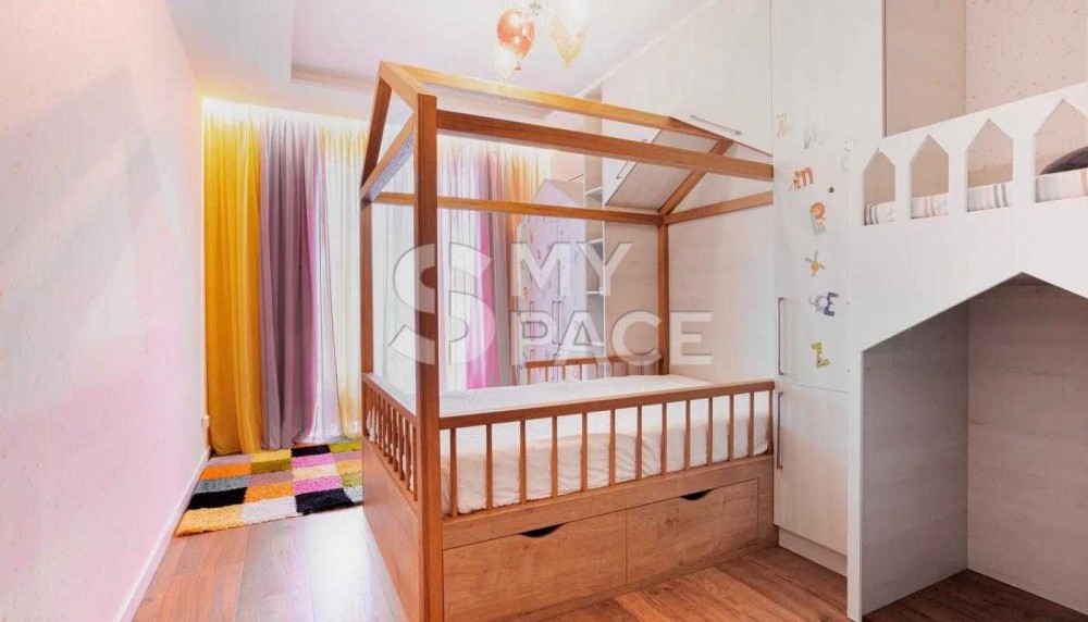 Ремонт виконано з використанням якісних матеріалів: натуральне дерево, паркетна дошка, італійська плитка. У квартирі є біокамін, великий висувний екран із проектором для домашнього кінотеатру та дві зручні комори.