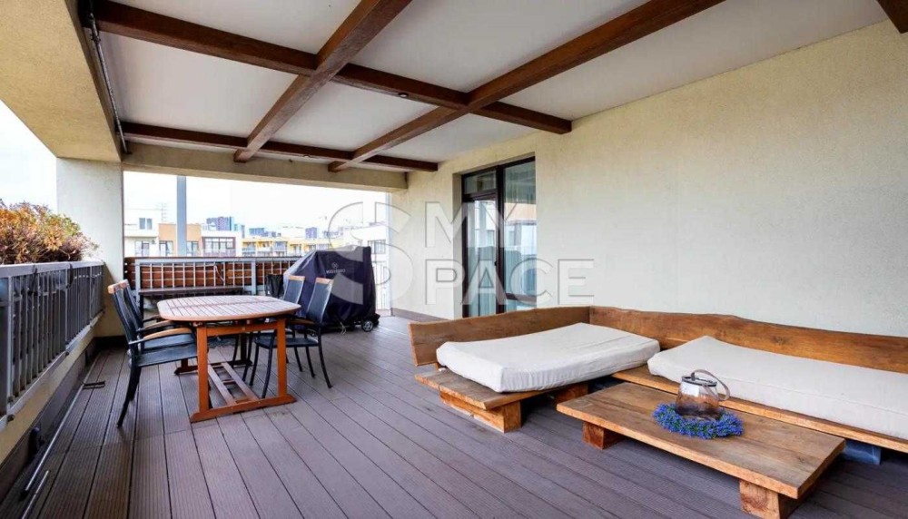 Просторі апартаменти з продуманим зонуванням: велика кухня-вітальня площею 67 м² та три окремі кімнати. Два санвузли, три балкони та простора тераса 35 м² з мангальною зоною — ідеальне місце для затишних вечорів на свіжому повітрі.