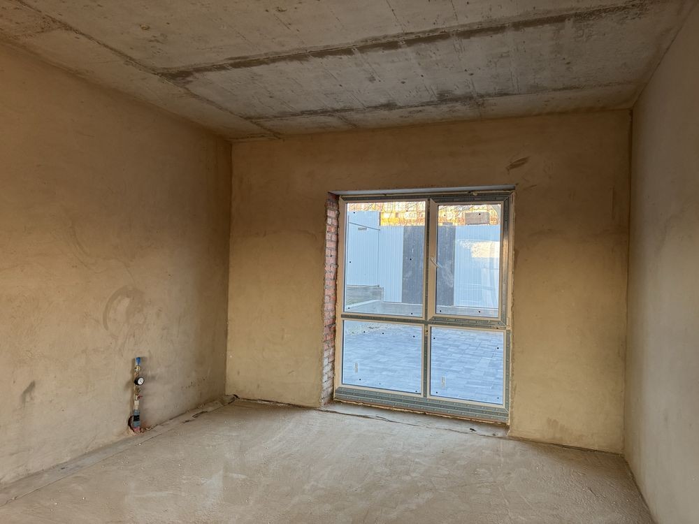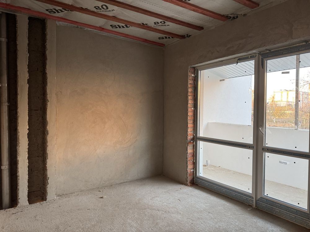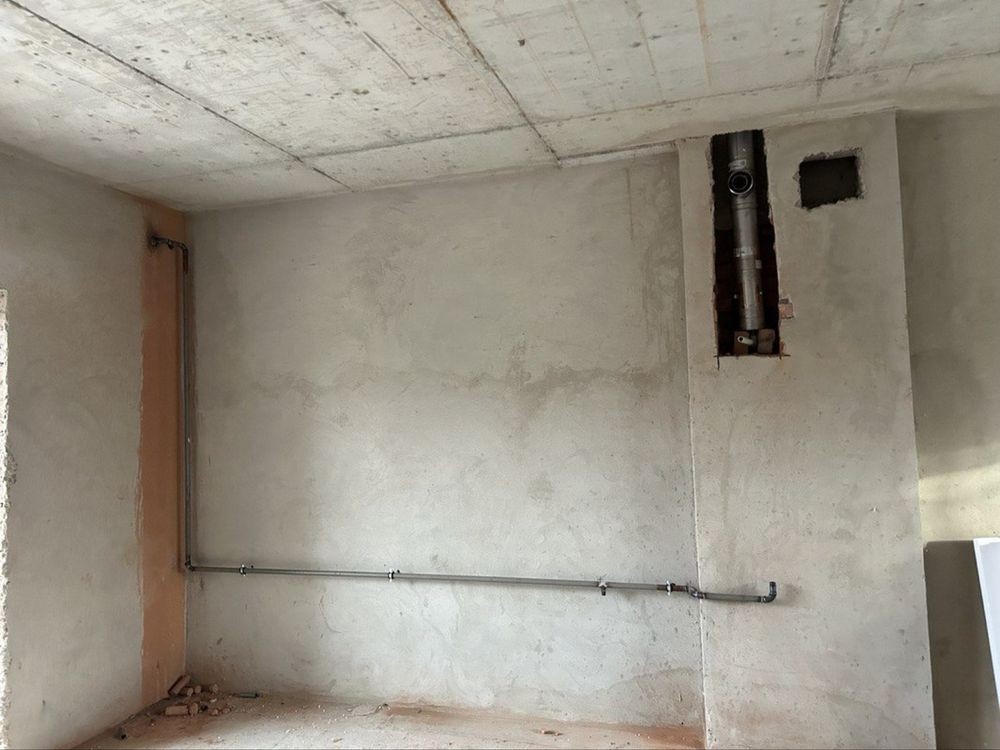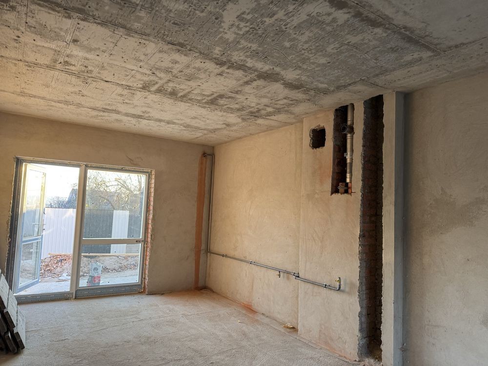 Стіни оброблені цементно-піщаною штукатуркою, підлога з лазерною чистовою стяжкою.