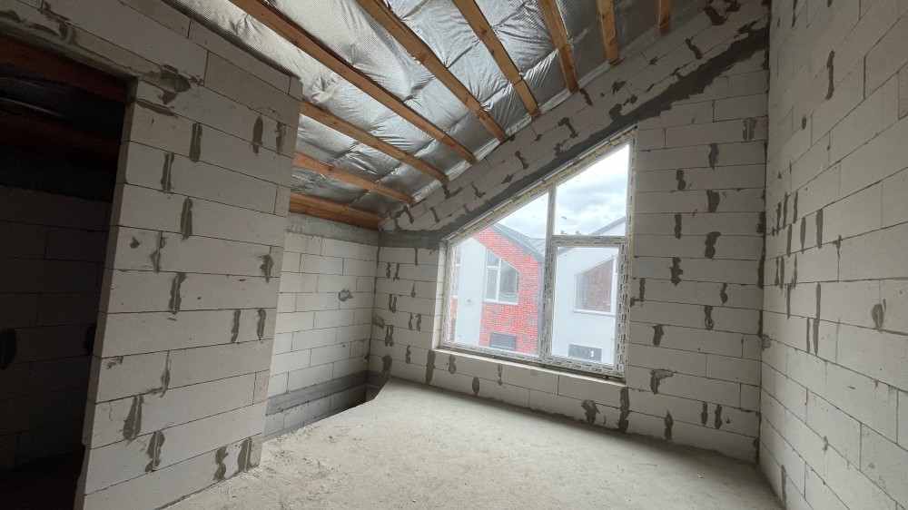 Збудований з газоблоку, утеплений пінопластом 150 мм. Монолітні перекриття.