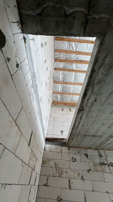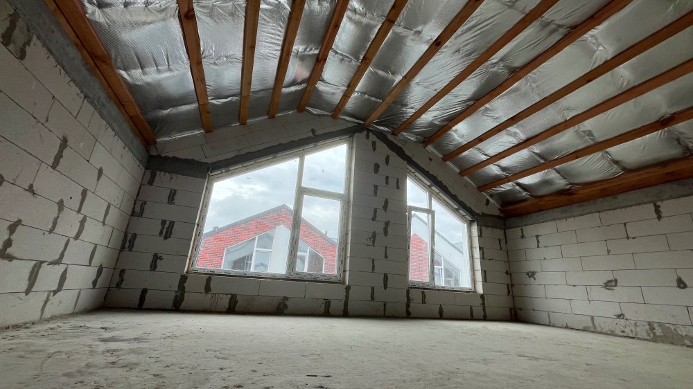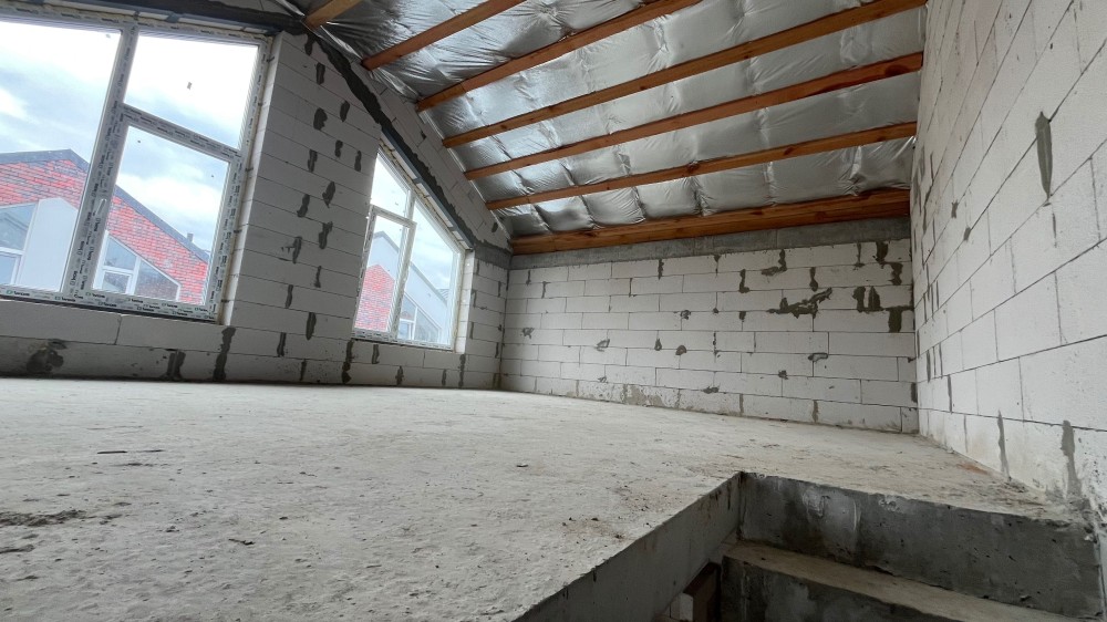 Збудований з газоблоку, утеплений пінопластом 150 мм. Монолітні перекриття.