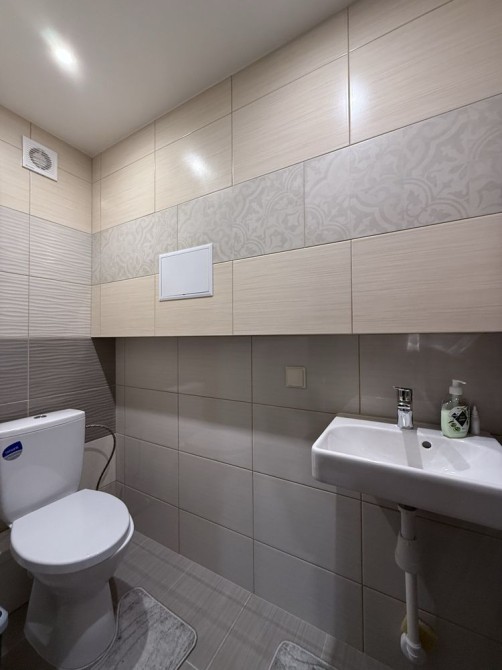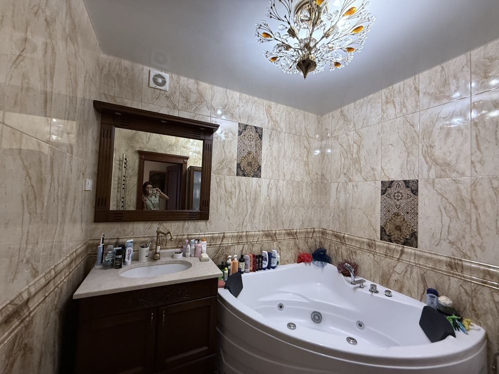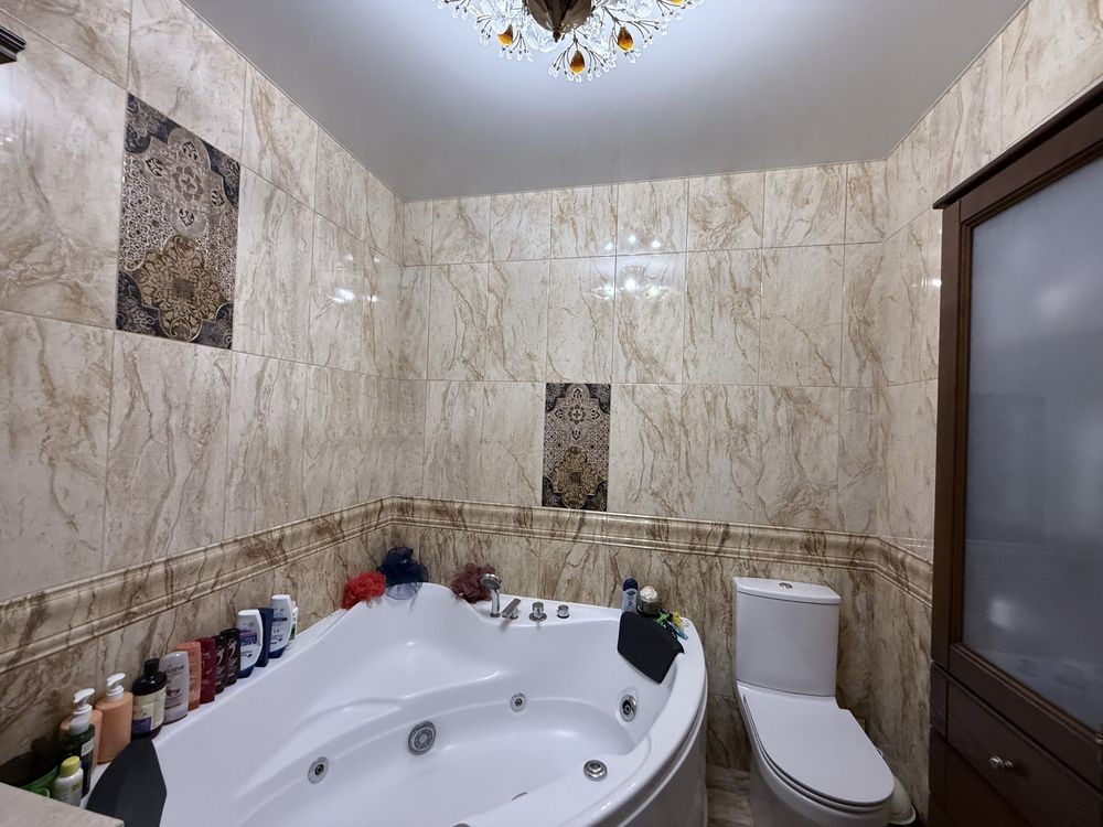 Стены декоративная штукатурка и венецианка , плитка испанская в санузле на втором этаже , немецкая сантехника , есть гигиенический душ , мебель в санузле из настоящего дерева .