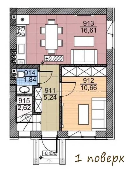 Перший поверх: коридор, санвузол, кімната кухня.