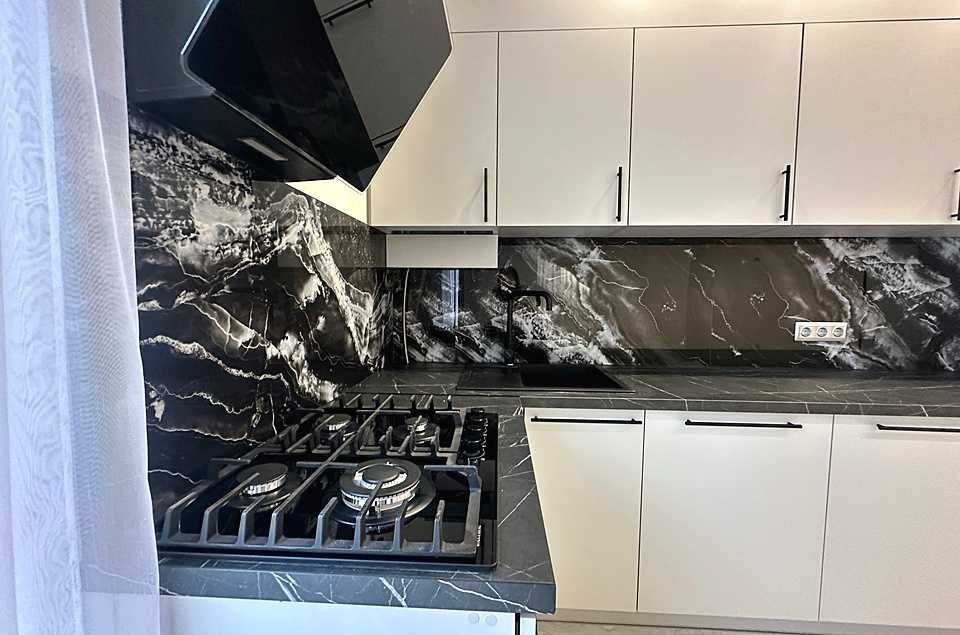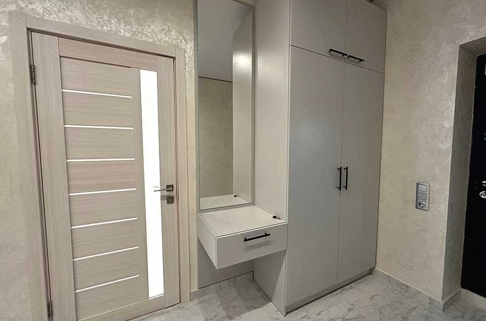 Зроблено ремонт у світлих тонах, на кухні встановлена вбудована кухня з технікою.