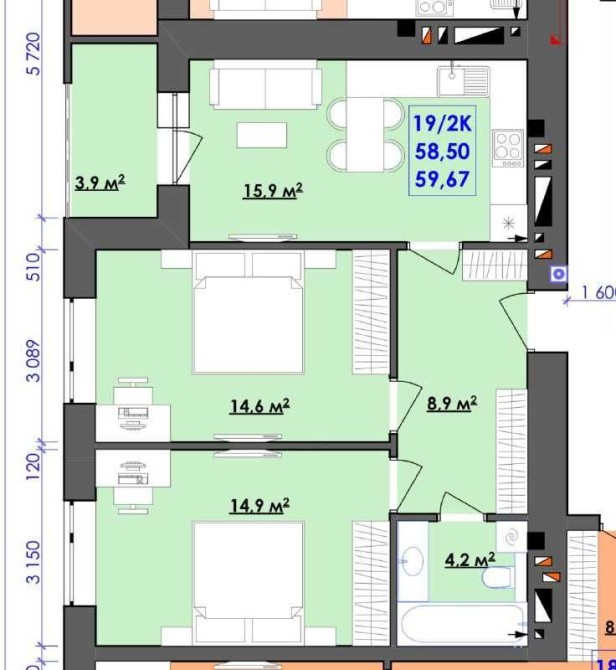 2-кім 58.5м2