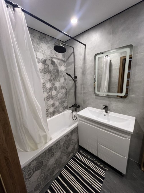 Сучасна плитка, ванна з тропічним душем, дзеркало з підсвіткою, вбудовані полиці.