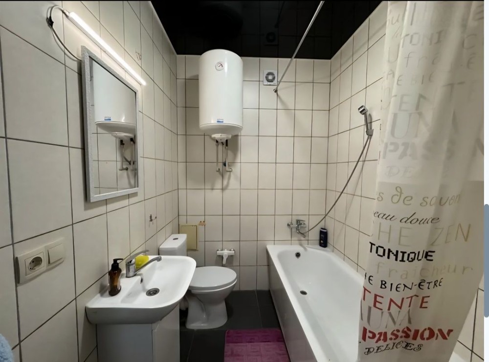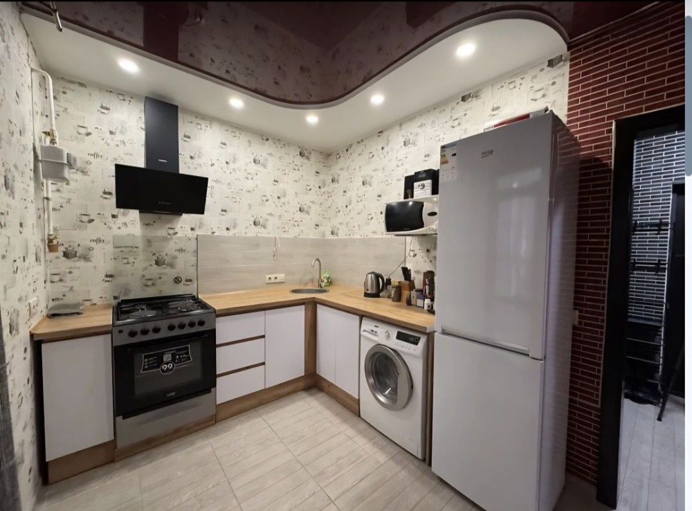 Плитка таламінат, імпортні шпалери, натяжні матова стеля, санвузол обкладений сучасною плиткою встановлена сантехника.