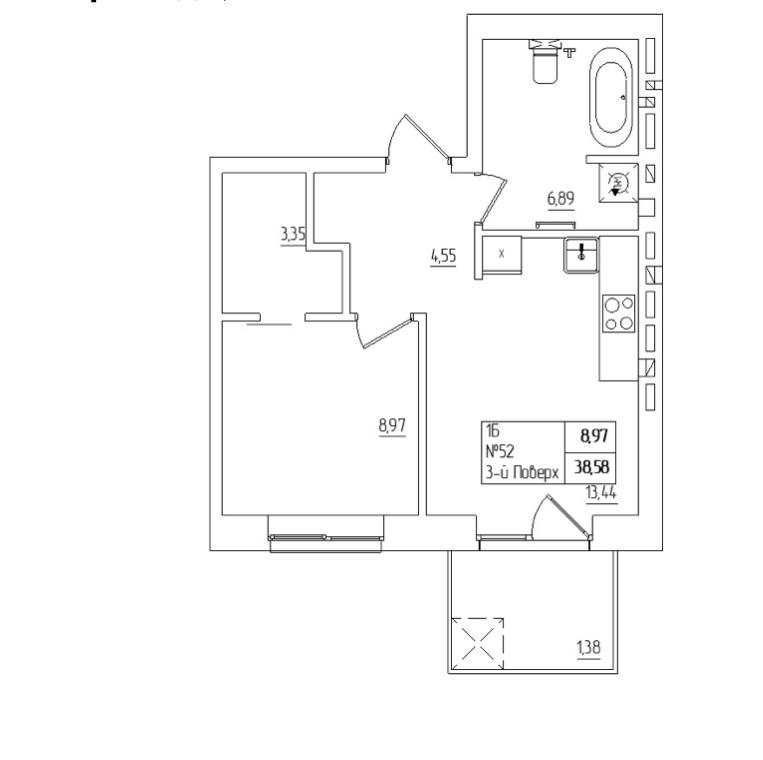 • Общая площадь 38.58 м2