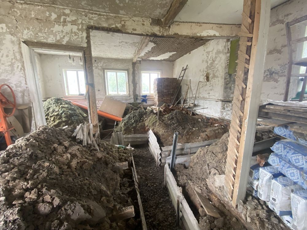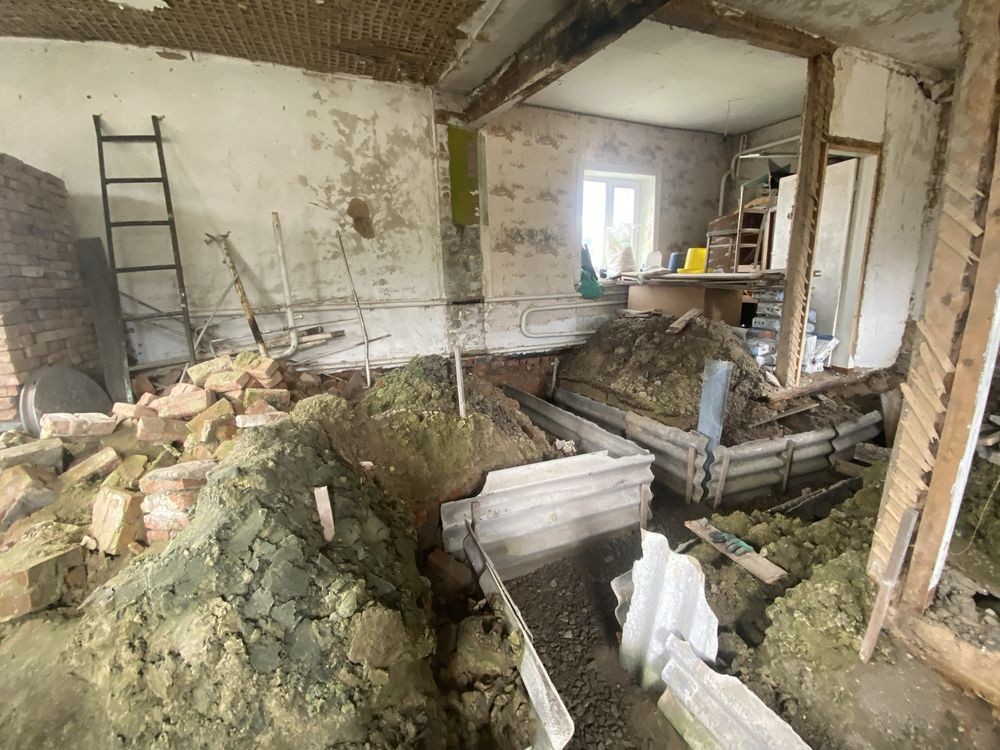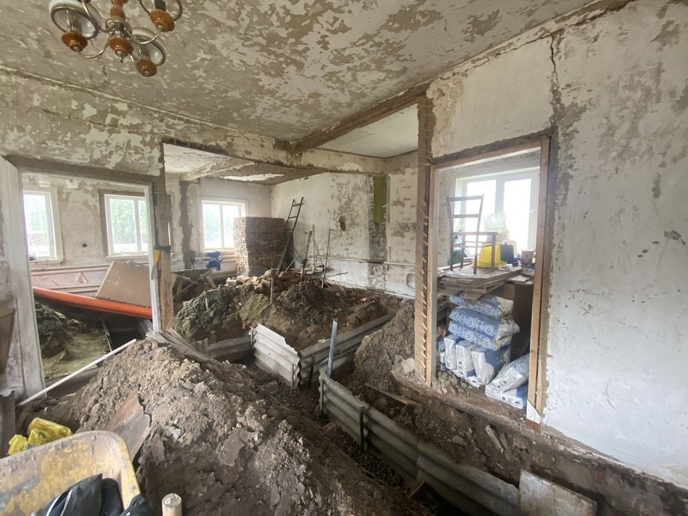 Будинок під капітальний ремон, туди не зайдеш і одразу жити не будеш. В середині почали будувати, позривали поли, стіни знесли, робили перепланування, виритий і просипаний фундамент під простінки.
