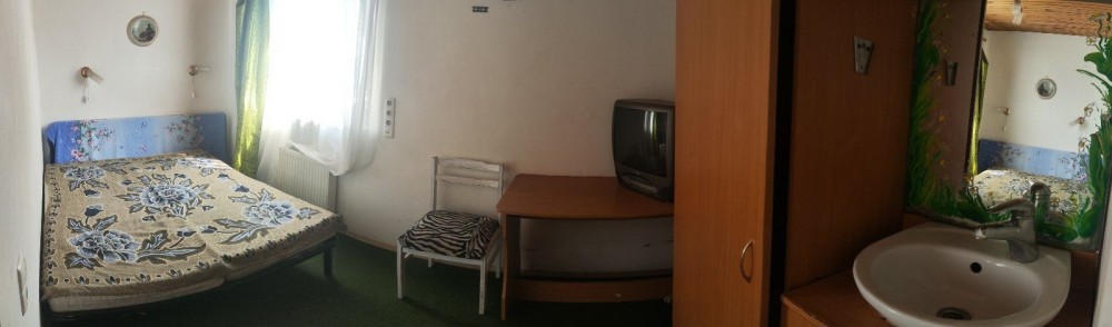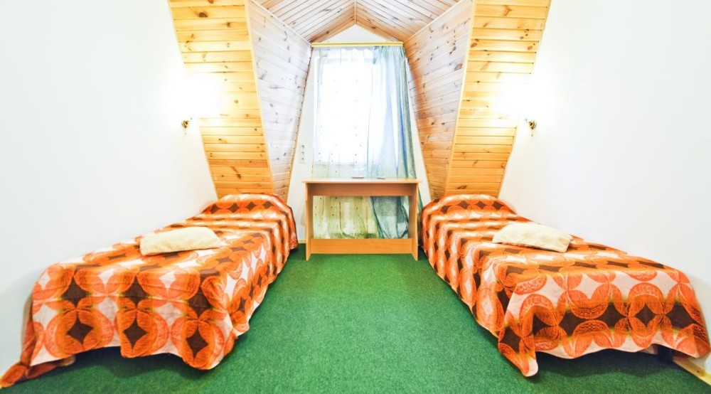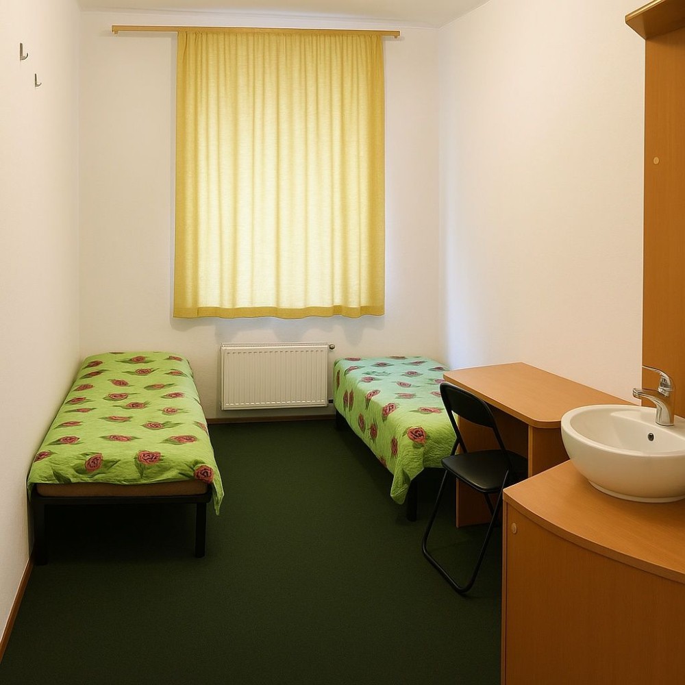 В комнате шкаф, две кровати, стол, умывальник.
