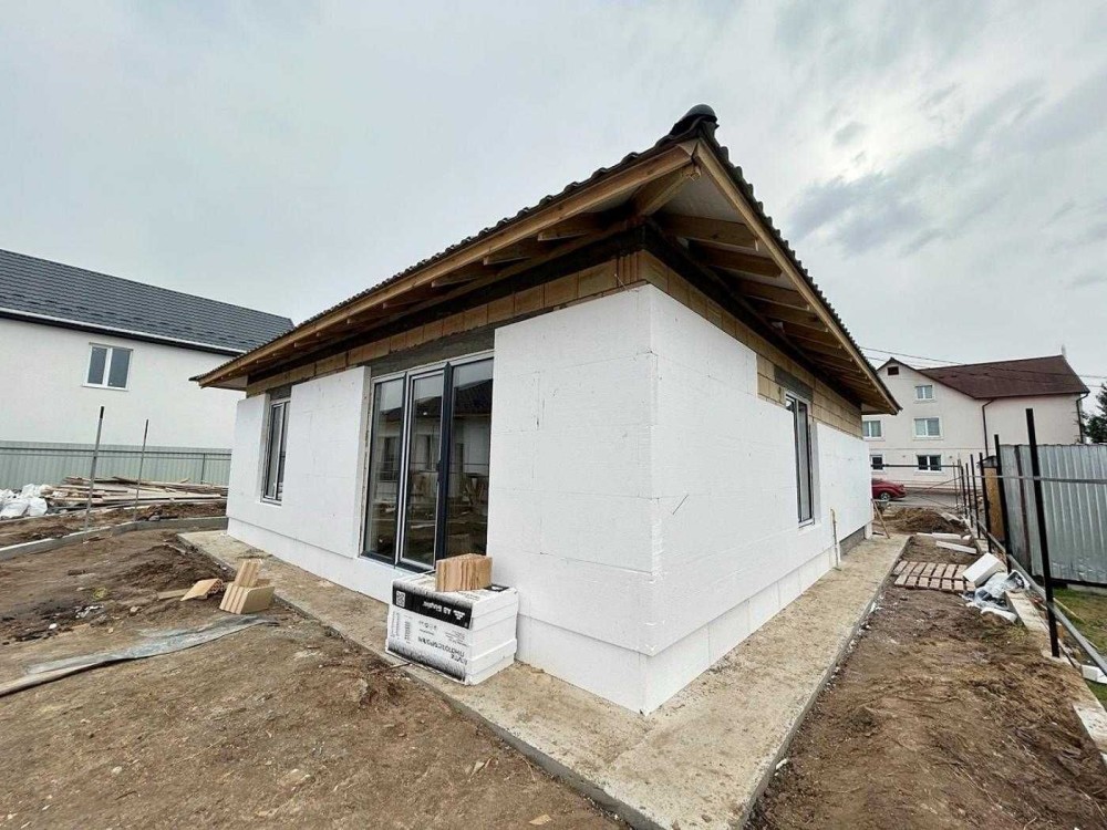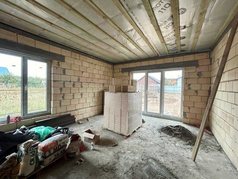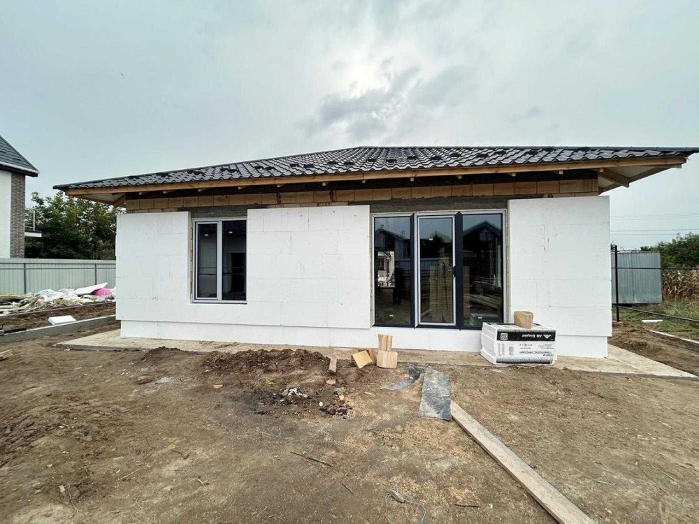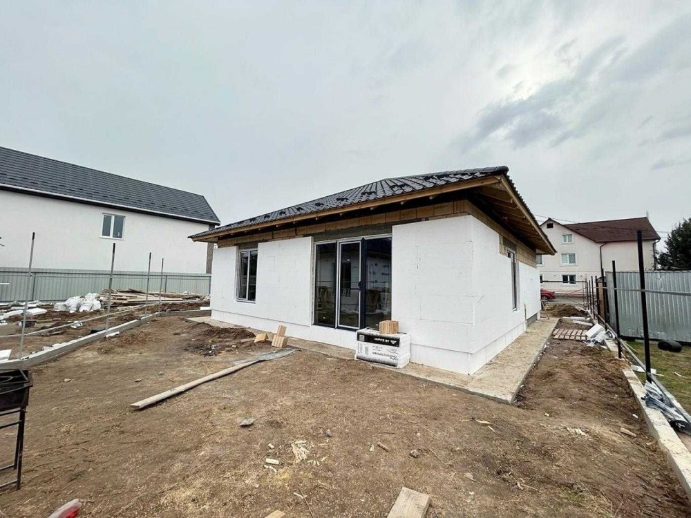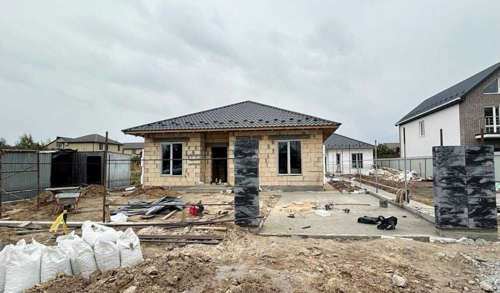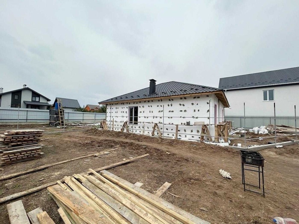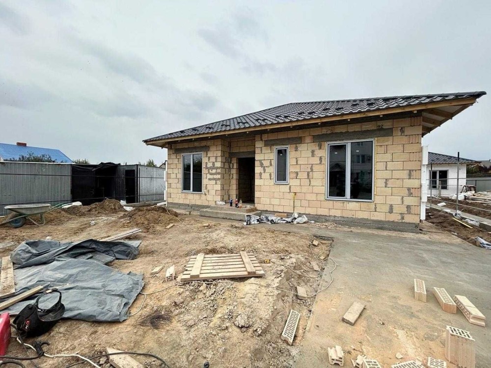 Будинок розташований на ділянці майже 6 соток. Прибудинкова територія огороджена, відмостка і місце для парковки залито бетоном і підготовлено під укладку тротуарної плитки.
