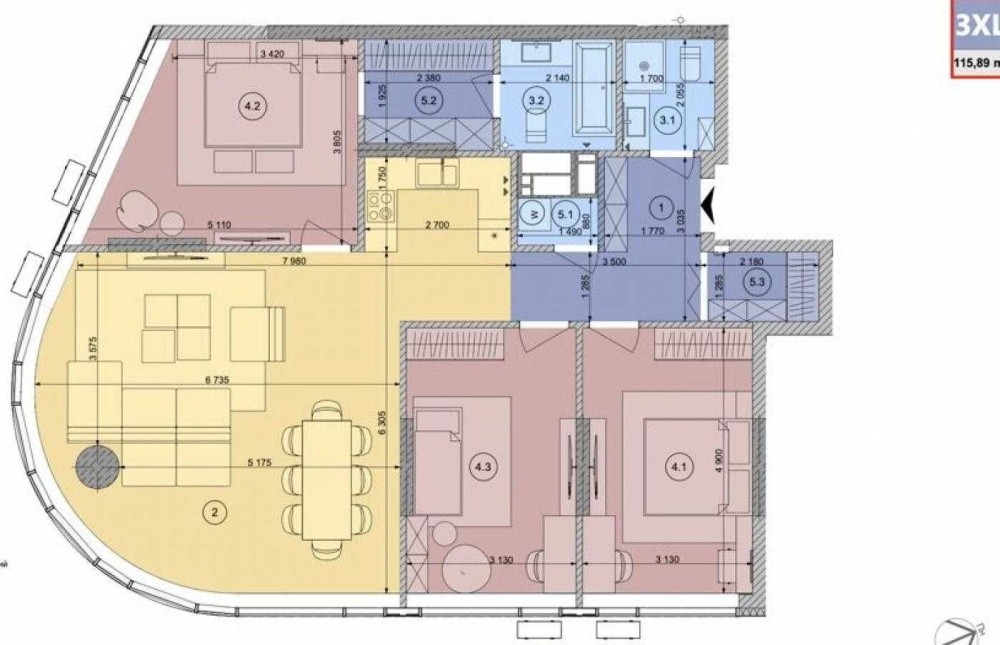 Загальна площа квартири 115,89 м2.