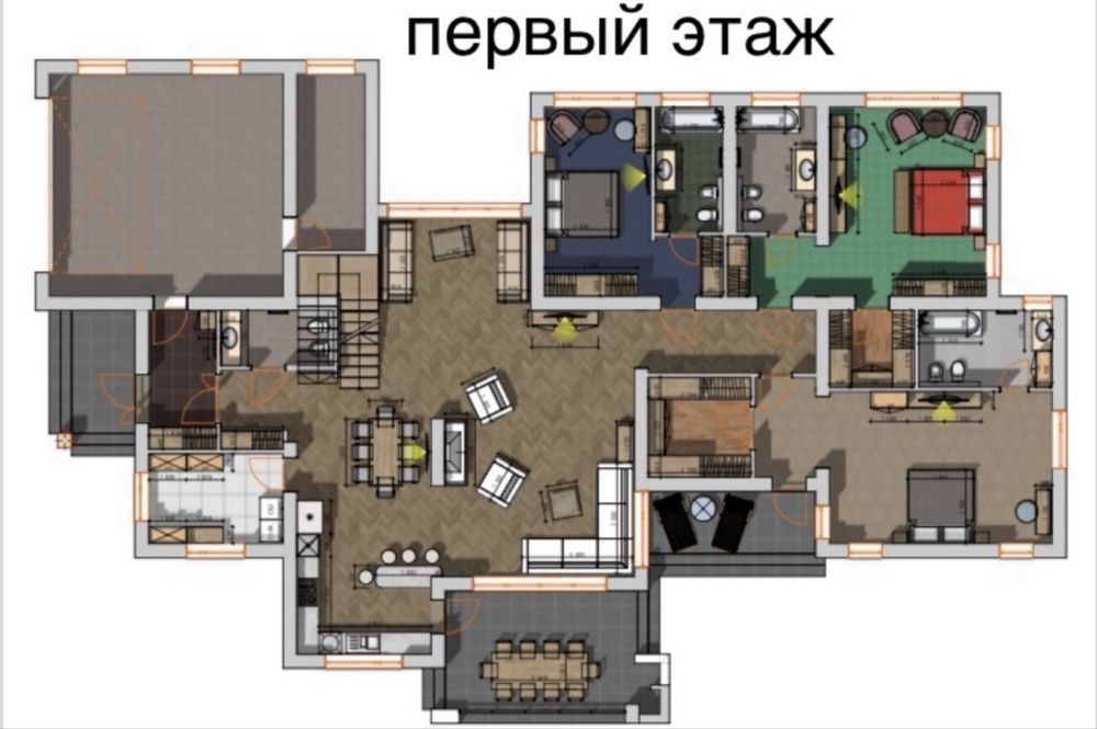 Дом с эксклюзивной, просторной и продуманной планировкой, первый этаж 285 метров квадратных, мансарда 92 метров квадратных, крытая терраса 40 метров, открытая терраса 32 метра. Первый этаж: три спальни (в каждой спальне свой санузел и гардероб), студия, гараж. Мансардный этаж свободной планировки (можно организовать спальни, кабинет, спортзал…)