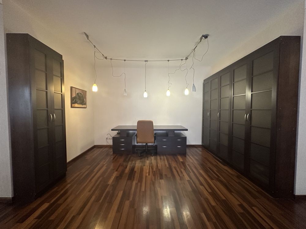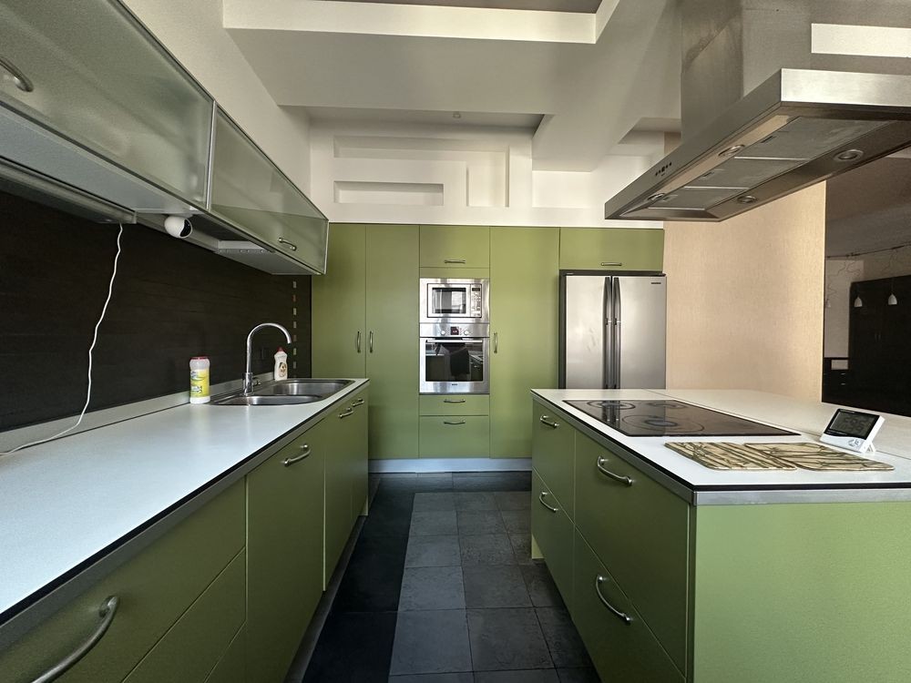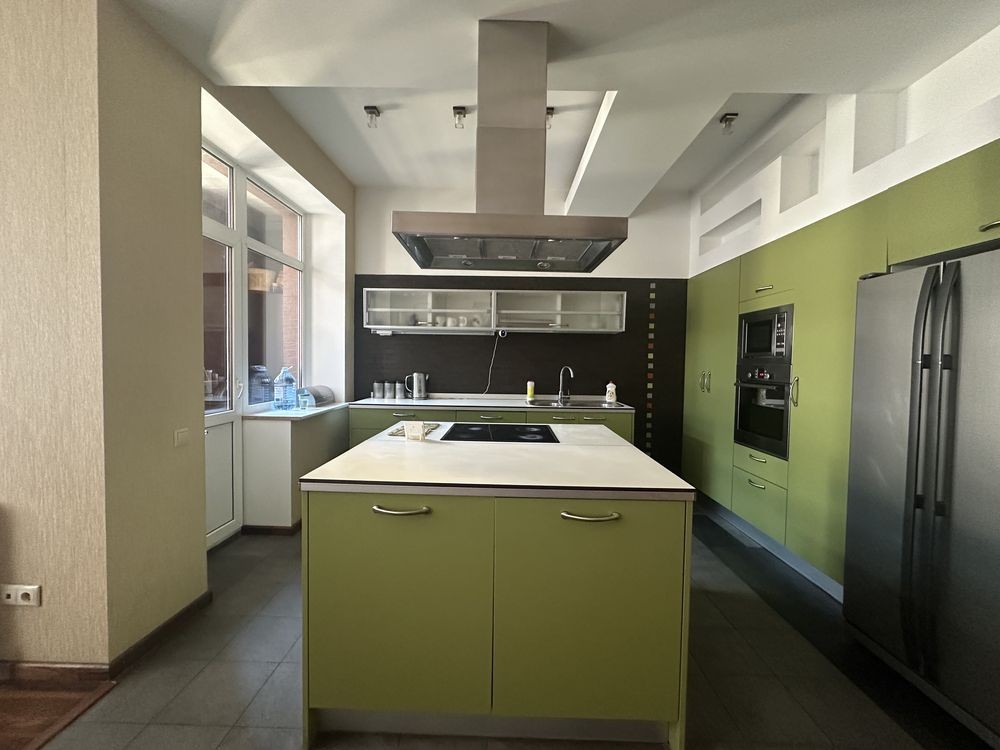 Окрема пральна-підсобне приміщення для пральної машини Samsung та сушіння. Кухня-студія: якісні італійські меблі BINOVA, вбудована побутова техніка BOSСH, німецька острівна витяжка по кубатурі приміщення. Підлога на кухні фанерована безпечною рельєфною кахельною плиткою, є вихід на балкон. Зона кабінету: величезний письмовий стіл із масивною стільницею та книжкові шафи з обох боків виконані на замовлення.