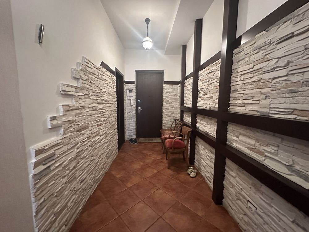 Вікна гостьової зони та майстер спальні на тихий камінчик, дві маленькі кімнати дивляться на подвір'я. Простора передпокій оформлена штучним каменем.