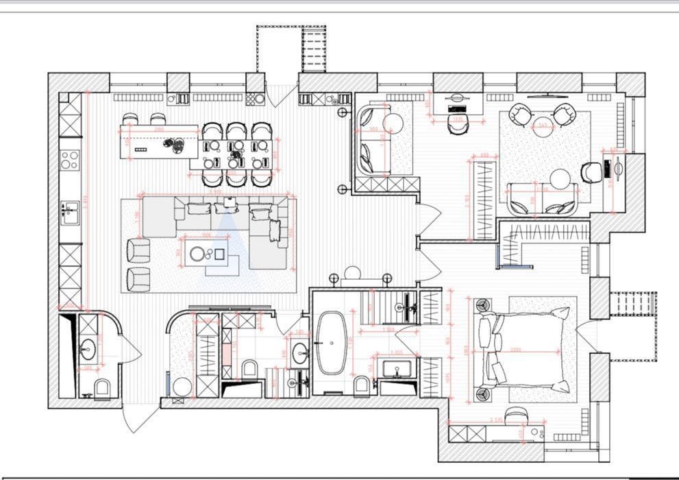 Кухня-гостиная, три спальни, три санузла, 2 балкона.