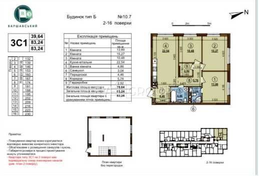 Трикімнатна квартира в ЖК Варшавський 3,будинок 10.7,84 м²Поверх 7