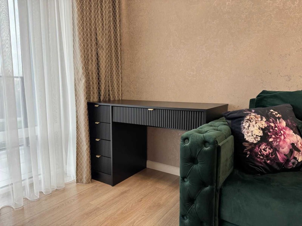 У спальні є ліжко, приліжкові тумби, шафа, бʼюті зона та телевізор.