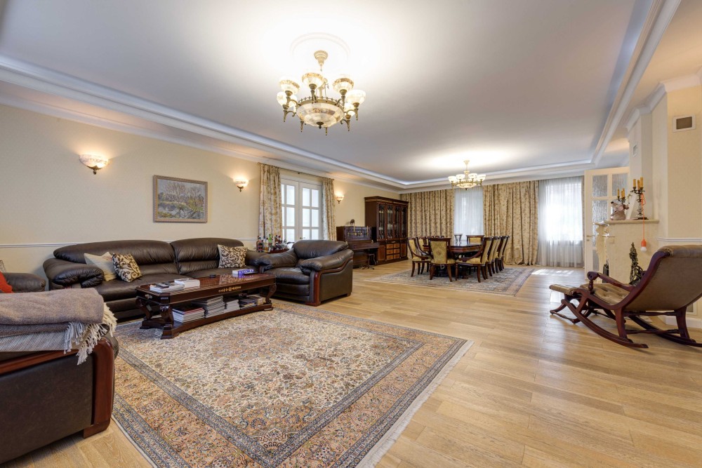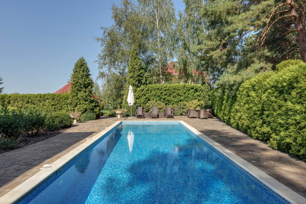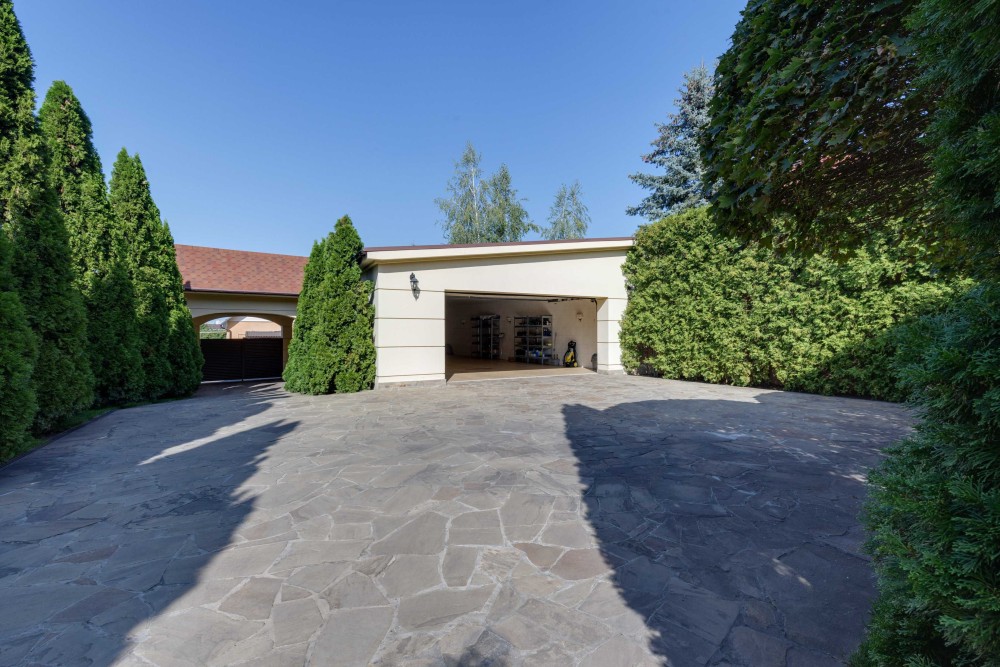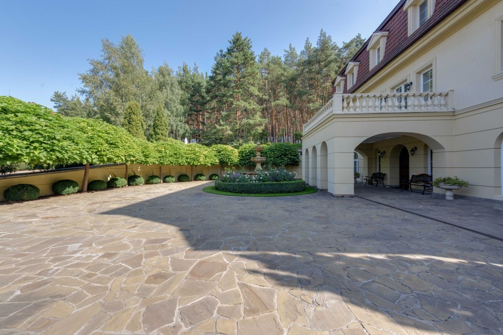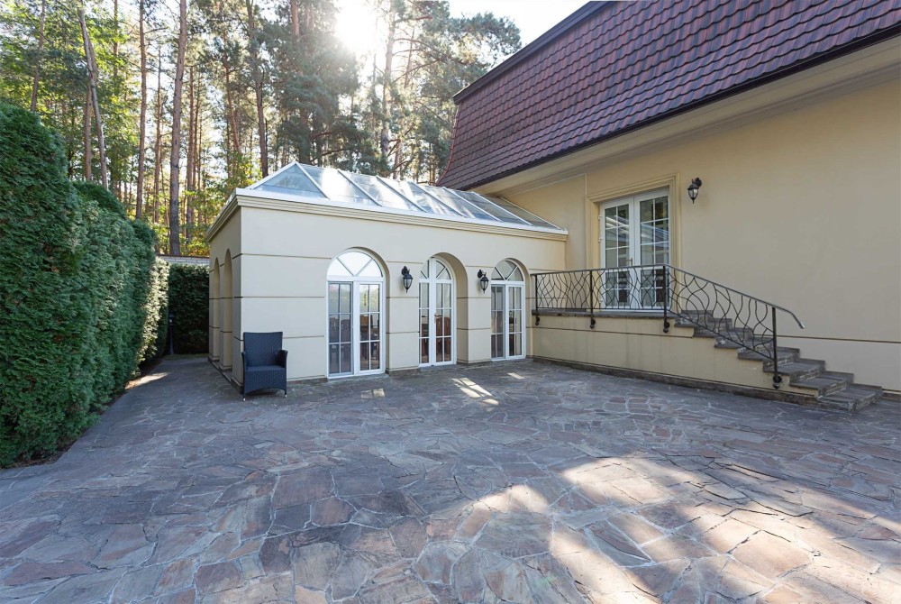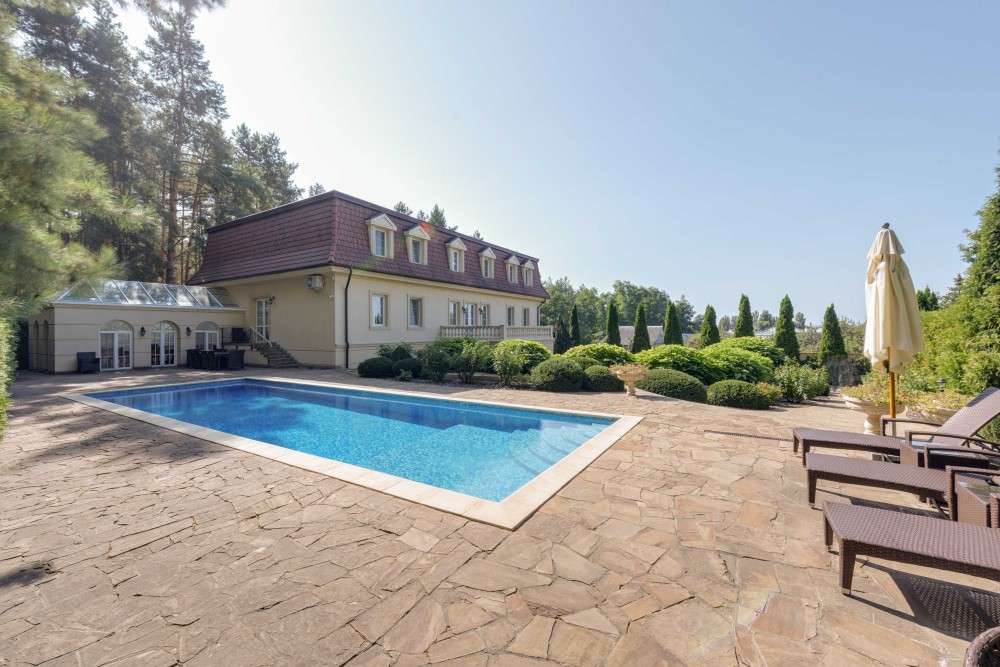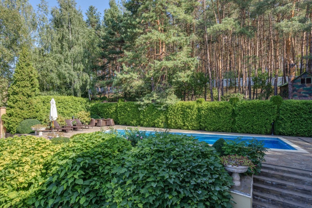 Ділянка з ландшафтним зонуванням: басейн, зона барбекю, зимовий сад, власний вихід до соснового лісу. Гостьова парковка, будинок для охорони та гараж на 4 авто.