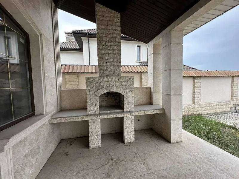 Крыша натуральная черепица, окна Rehau 5-ти камерные. Межкомнатные стены из красного кирпича. Фасад 1-ый этаж: травертин, 2-й этаж украшен дорогой краской, которая переливается на солнце.