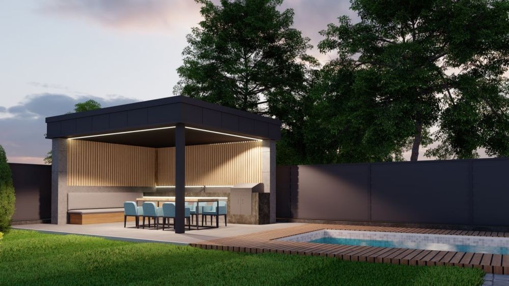 — Светлая кухня-гостиная с панорамным выходом на террасу и задний двор.