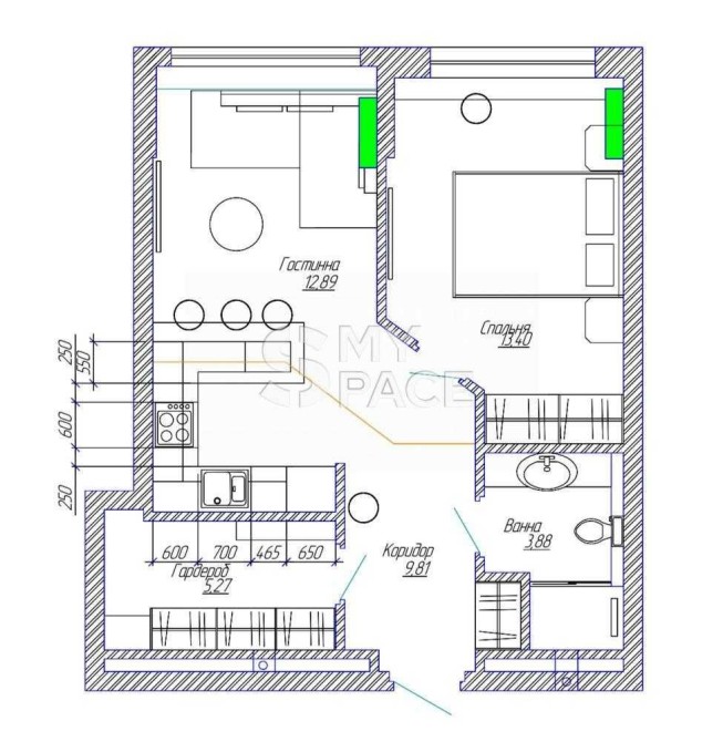 • Площадь кухни 12.89 м2