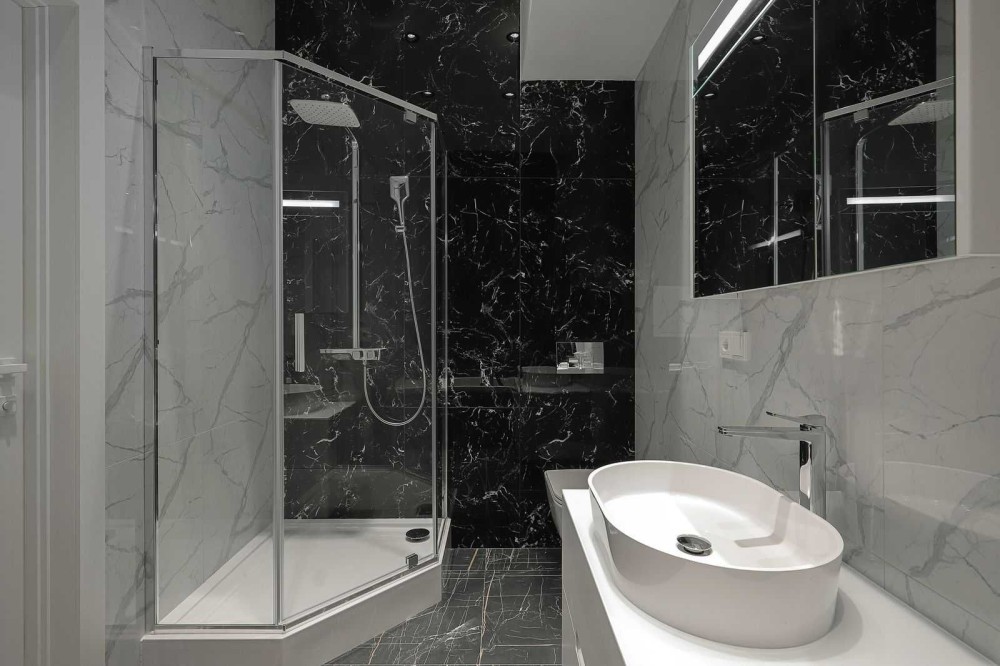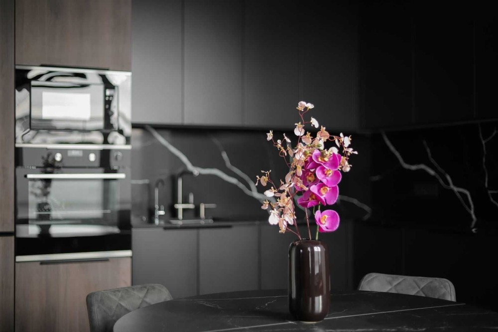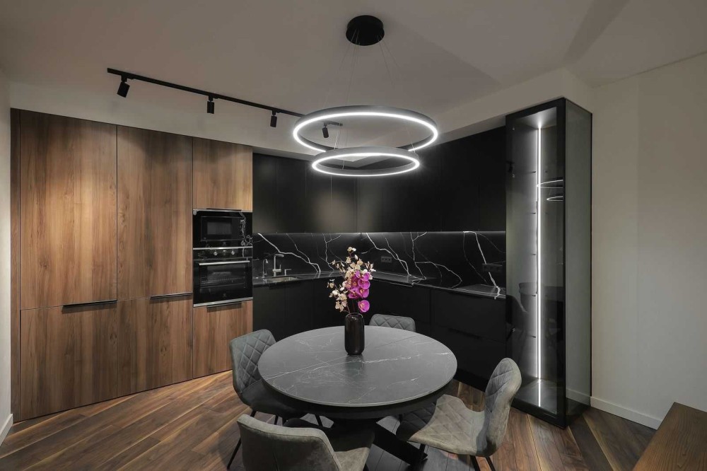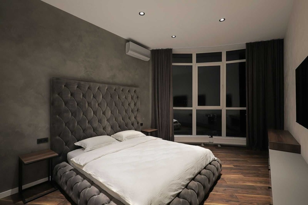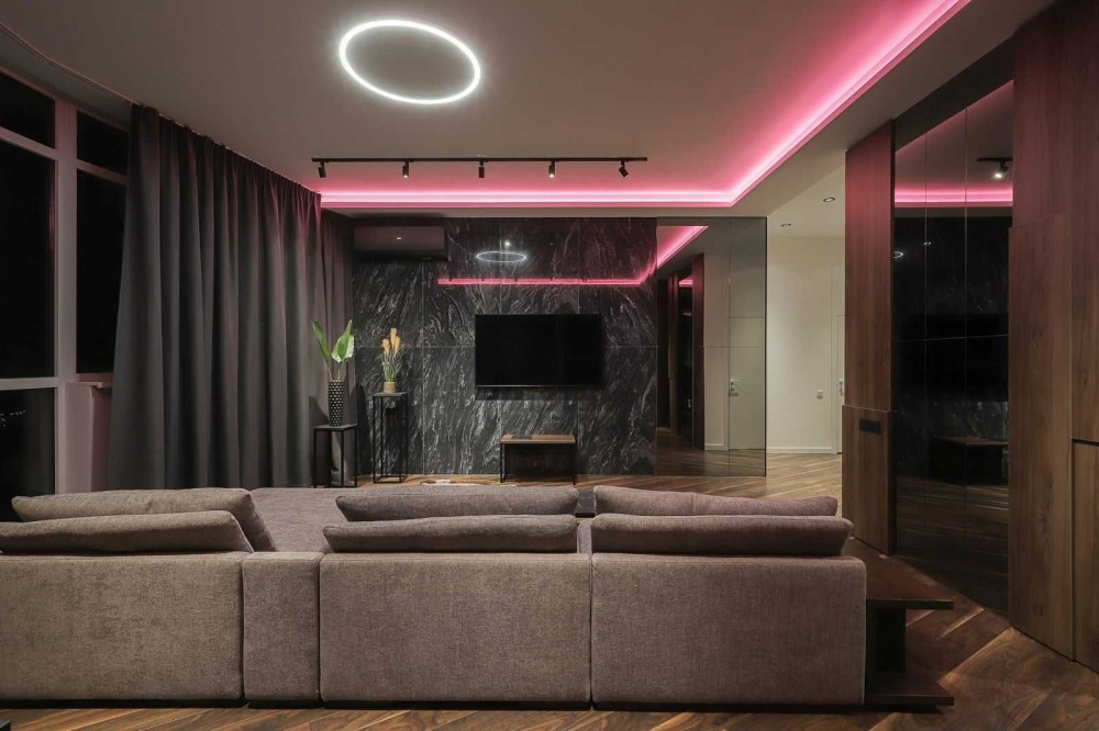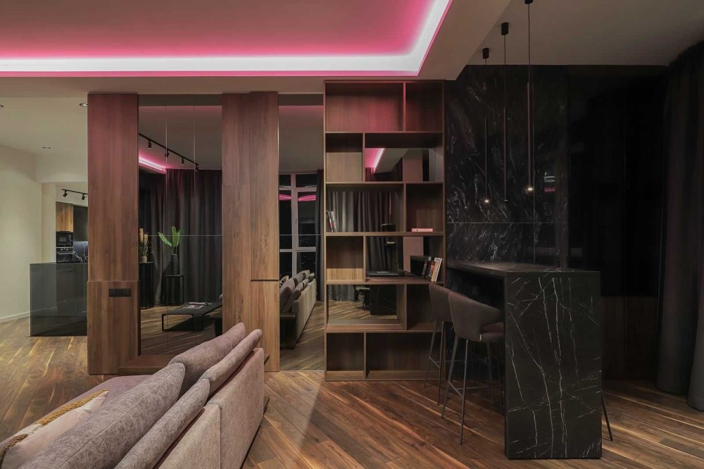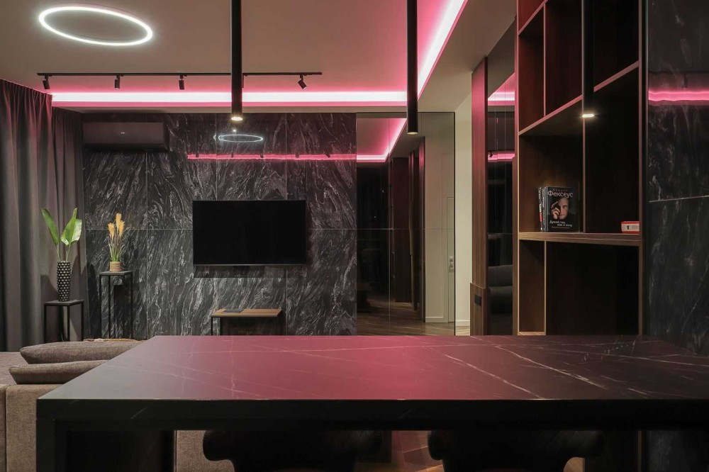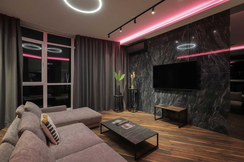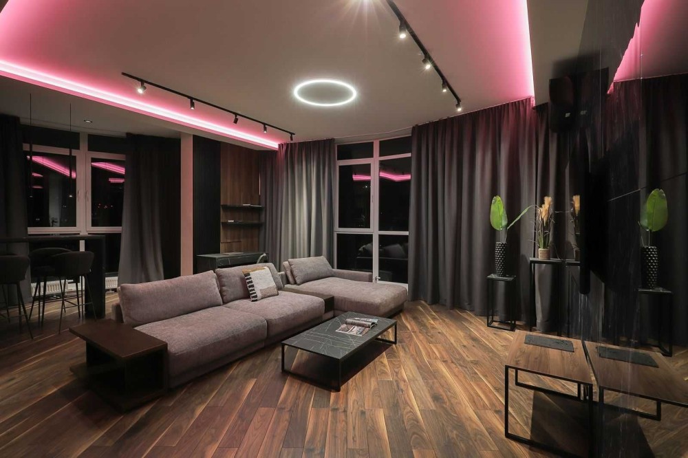 Ваш новый двухэтажный пентхаус площадью 170м² — это оазис стиля и комфорта, выполненный в смелых темных тонах. Откройте для себя просторную гостиную 70м² с витражными окнами, которые наполняют пространство светом днем и создают уютную атмосферу с помощью неоновой подсветки вечером.