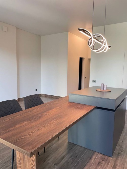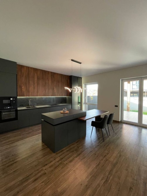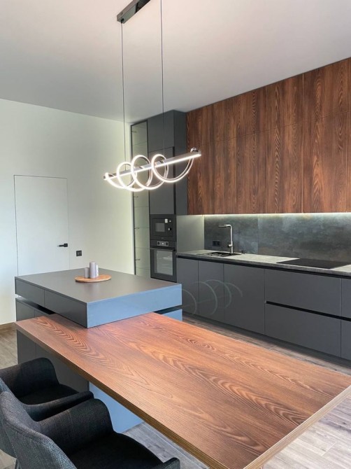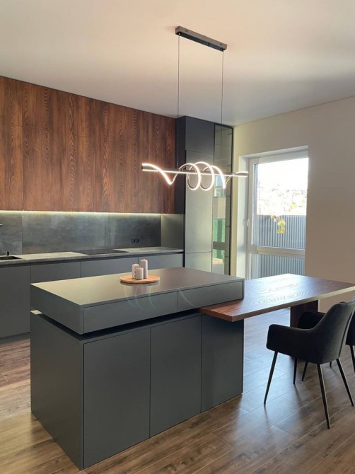 Простора кухня-студія з острівцем — місце, де сім’я збирається разом, де гості захоплюються атмосферою, а кулінарія стає задоволенням.