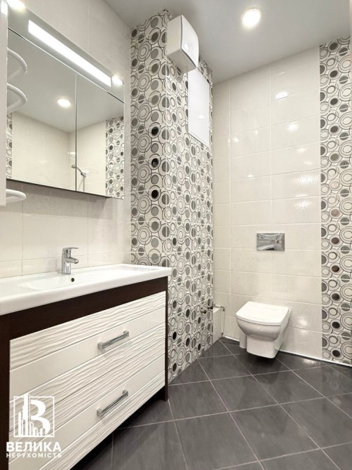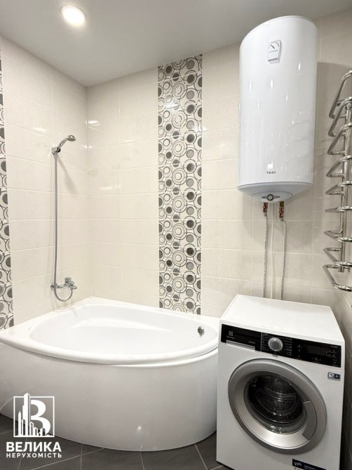 Санвузол #1 з великою кутовою ванною, пральна машинка, великий бойлер, інсталяція унітаз, навісна тумба, дзеркало з підсвіткою, 2 рушникосушки.