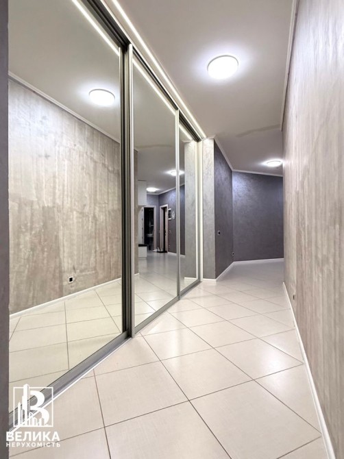 Простора вхідна група та просторий коридор з великою вбудованою шафою та красивими дзеркалами в підлогу.