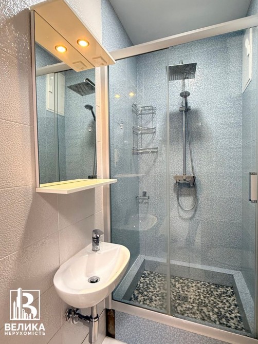 Санвузол #2 з душовою кабіною, великим бойлером, рукомийник, унітаз, дзеркало.
