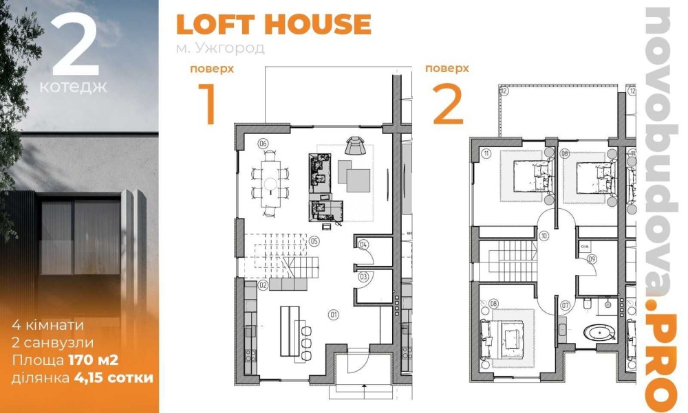 Загальна площа котеджу 170 м² (без врахування терас та балконів).