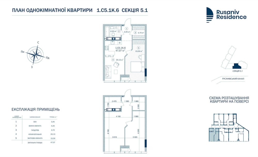 - Загальна площа: 47.07 м²