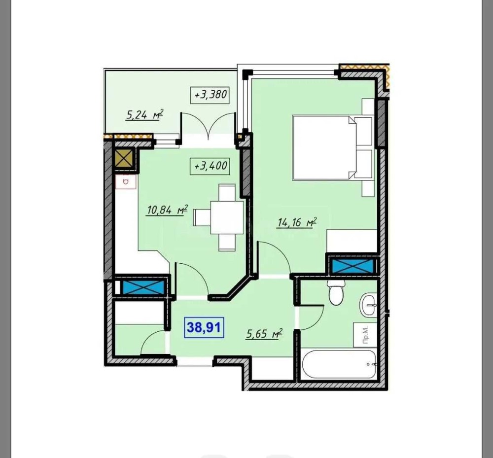 • Общая площадь 38.91 м2