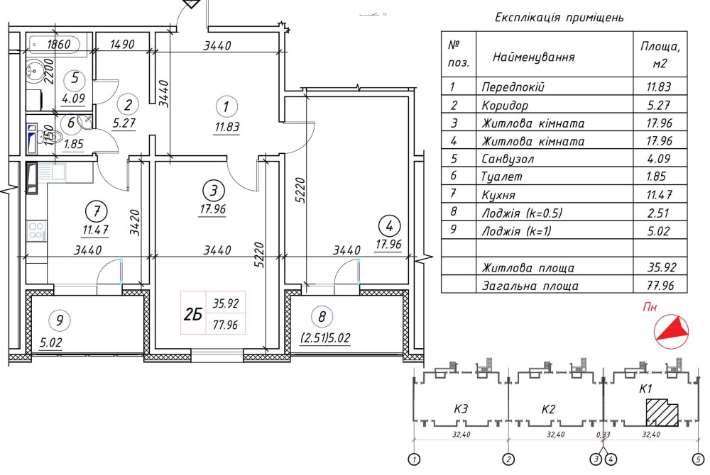 • Загальна площа — 77.96 м²