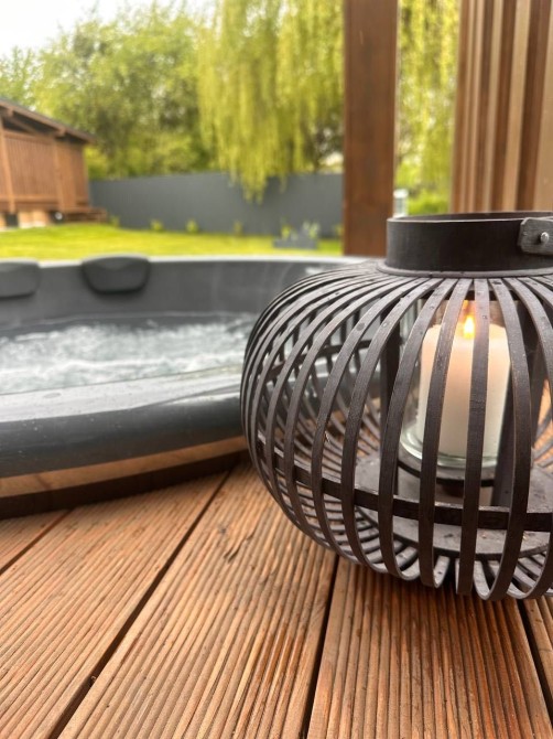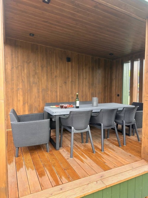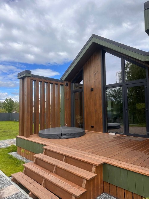 Велика тераса плавно продовжує житловий простір — ідеальна для ранкової кави, медитацій або вечірніх зустрічей. На ній розташований чан-джакузі, інтегрований у дерев’яну палубу.
