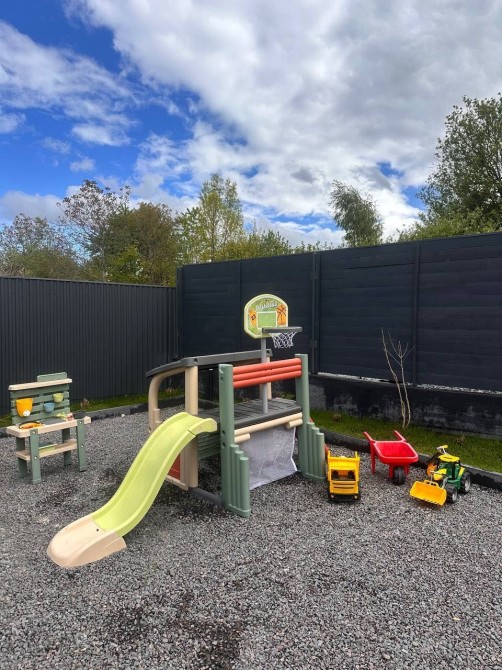 На закритій приватній території знаходить басейн із підігрівом та дитячий майданчик, де зможуть провести час малюки.