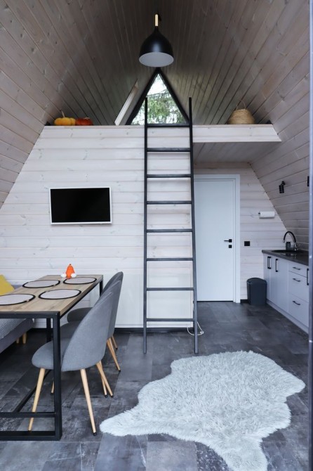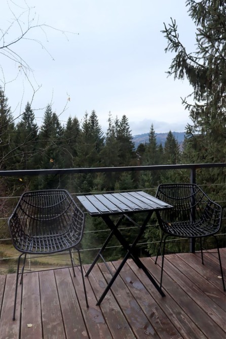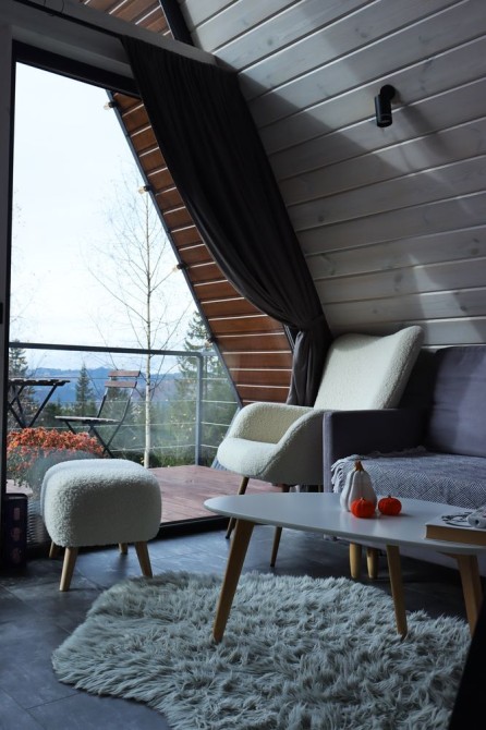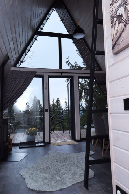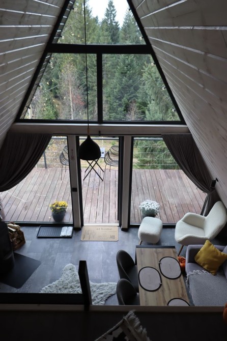 Forest Hust Yablunytsya-це два будинки A-frame в сучасному стилі з великою панорамою, де відкриваються прекрасні краєвиди гір, які розташовані у тихій місцині Яблуниці.