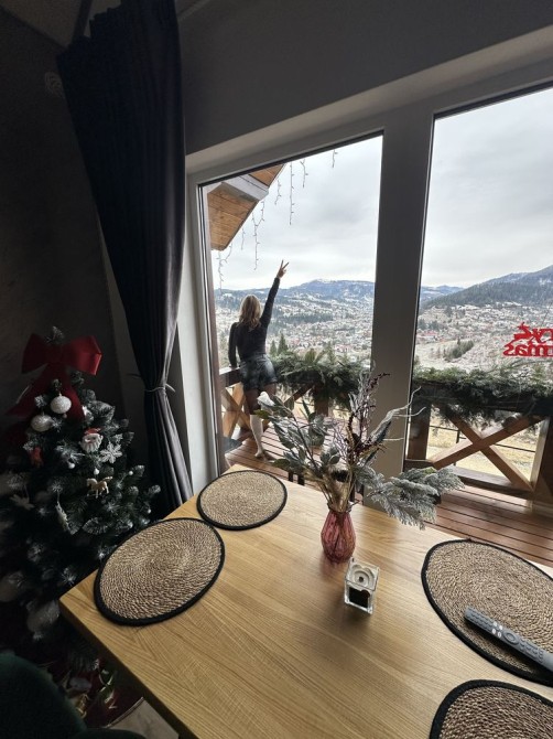Чудовий вид на Карпати з балкона. Затишна дерев'яна альтанка з видом на засніжені гори та долину. Ідеальне місце для відпочинку та насолоди природою під час відпустки.