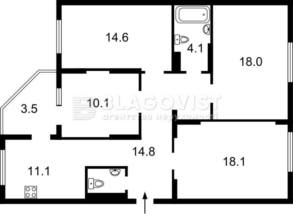 • Площадь кухни 11.1 м2