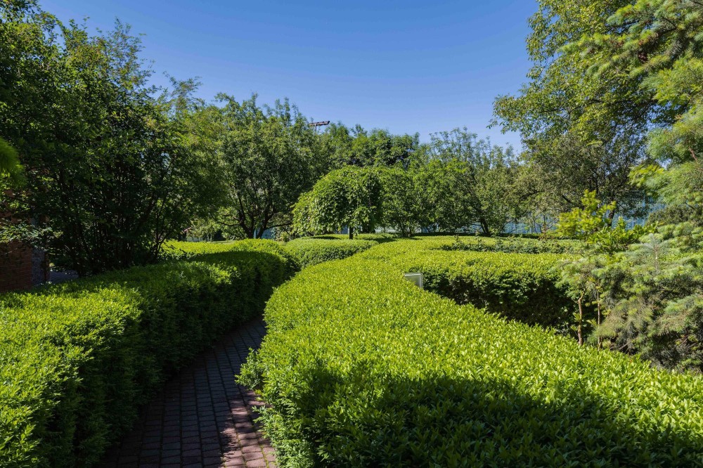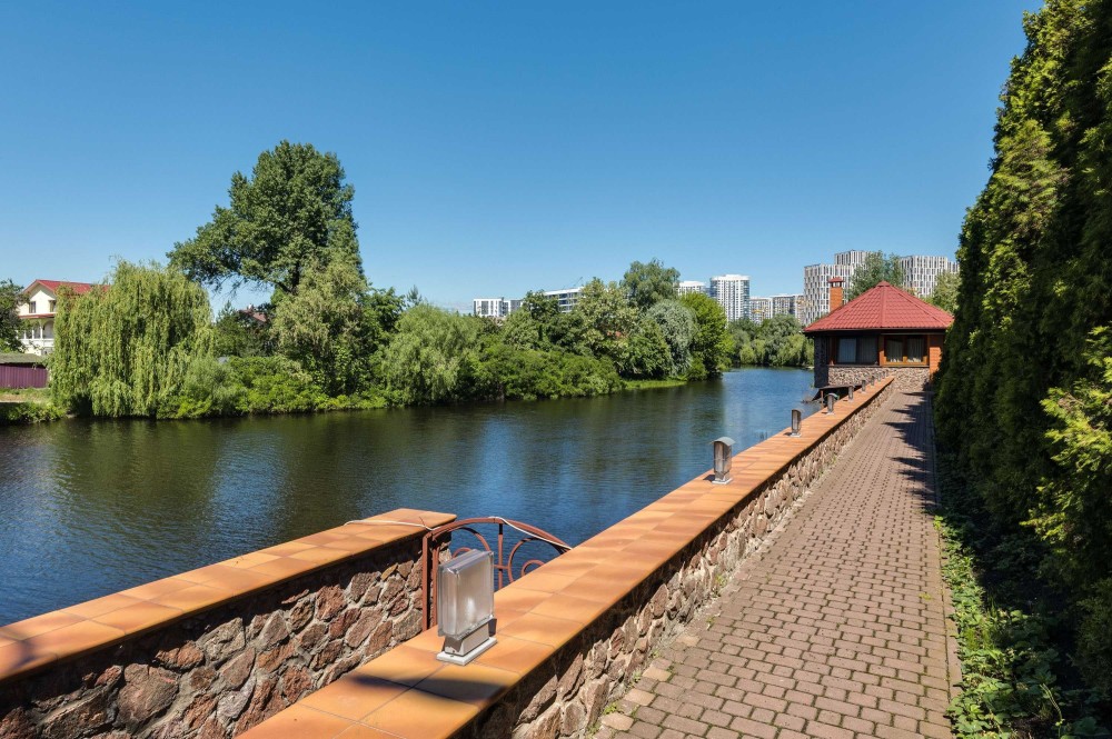 Потрясающий современный особняк находится в районе элитной частной застройки на юге Киева с прямым выходом к живописному озеру, невероятным самшитовым садом и является настоящим воплощением спокойствия и безмятежности.