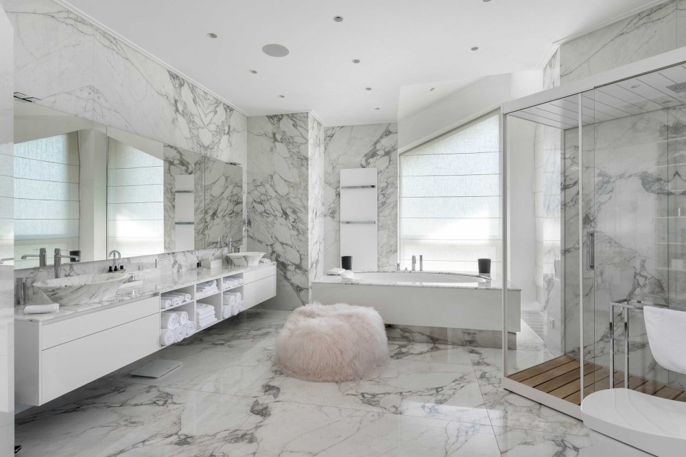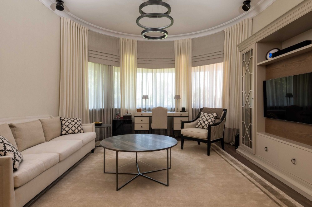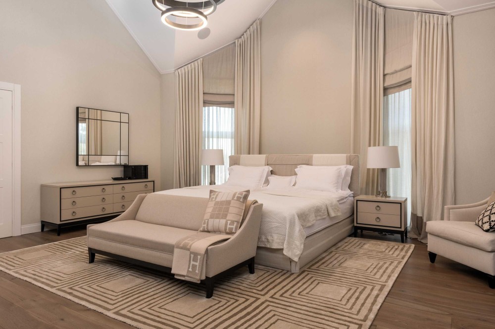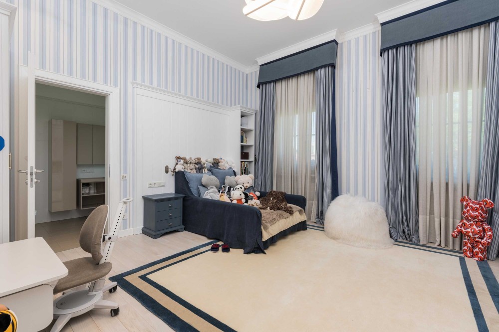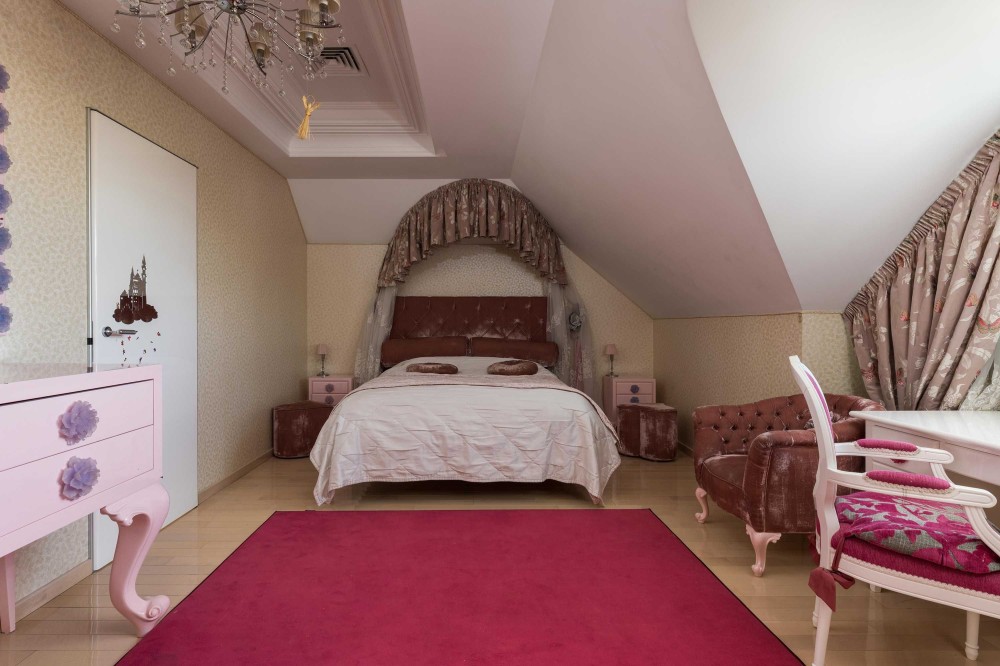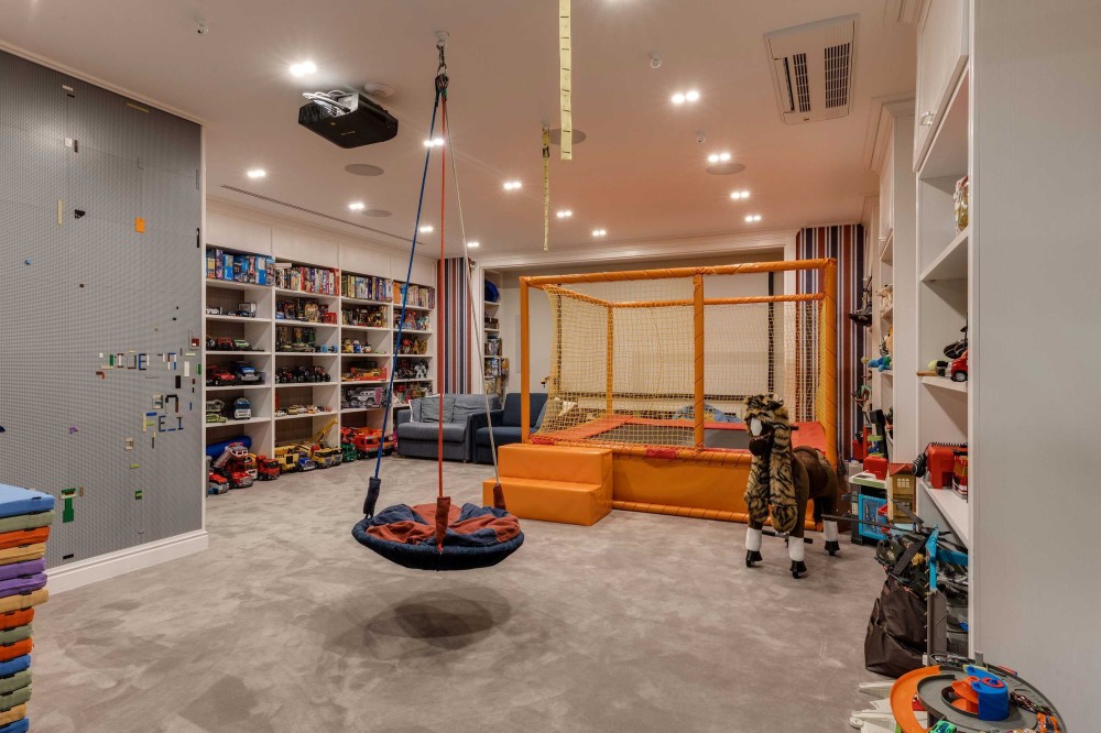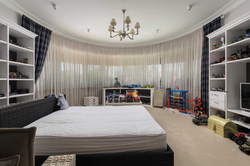 Интерьеры и экстерьеры особняка площадью 1000 кв.м. создают эксклюзивный образ жизни. На трех уровнях расположились: гостиная с большим обеденным столом, зимний сад с уютной зоной отдыха у камина, мастер-спальня с личной ванной комнатой, кабинет, 4 спальни, каждая со своей ванной комнатой, детская игровая с батутом, постирочная, комната для персонала, котельная. На цокольном этаже размещена профессиональная кухня с лифтом для посуды в столовую зону.