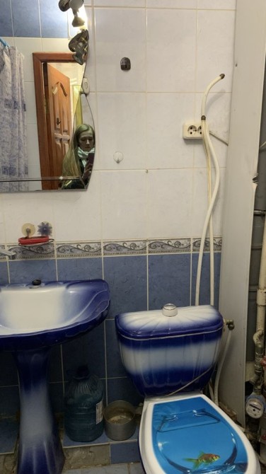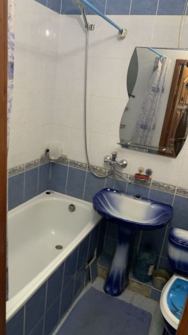 Сумісний санвузол, облицьований плиткою. Пральна машина, холодильник, диван, меблева стінка, кондиціонер.