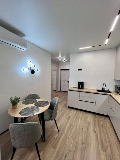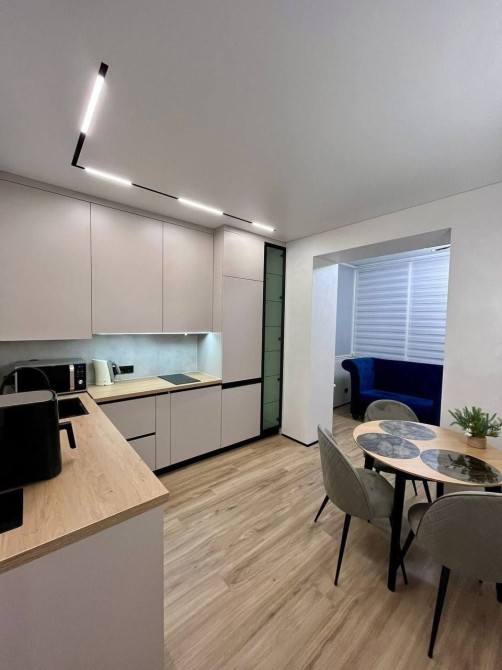 Кухня- вітальня повністю вмебльована, сучасний дизайн, панорамний вид та лоджія,є кондиціонер, гриль, мікрохвильовка, електрочайник, плита, також зручна обідня зона.