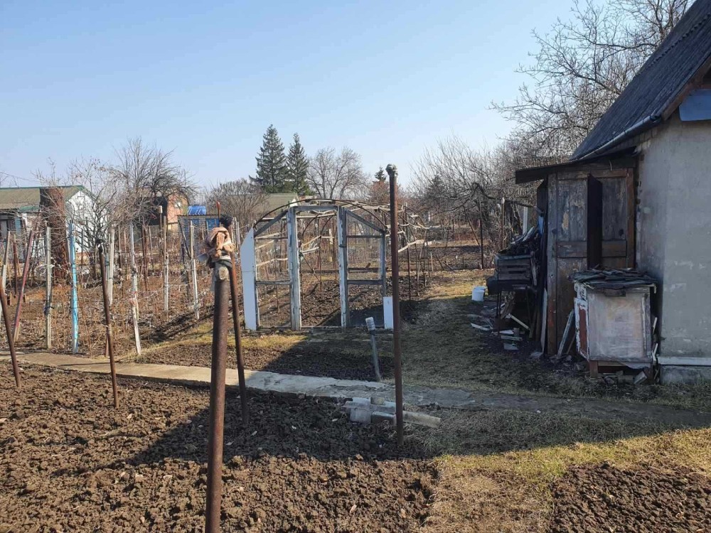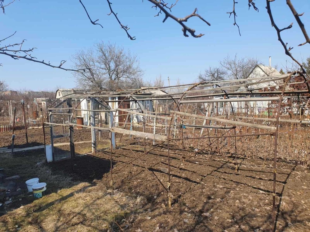 На участке плодовые деревья, малина, клубника. Каркас теплицы (под плёнку) 2,2м х 6м.
