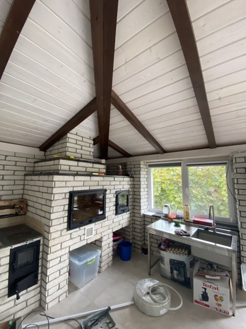 Велика тераса з теплою підлогою, в якій можна проживати. На терасі розміщена зона із 3-х печей : шпаргат, мангал під склом та піч для випічки хліба.
